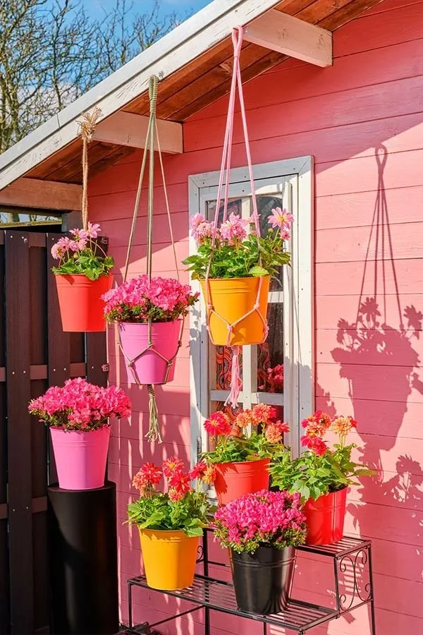23 | Hang colorful pails and fill them with pretty flowers