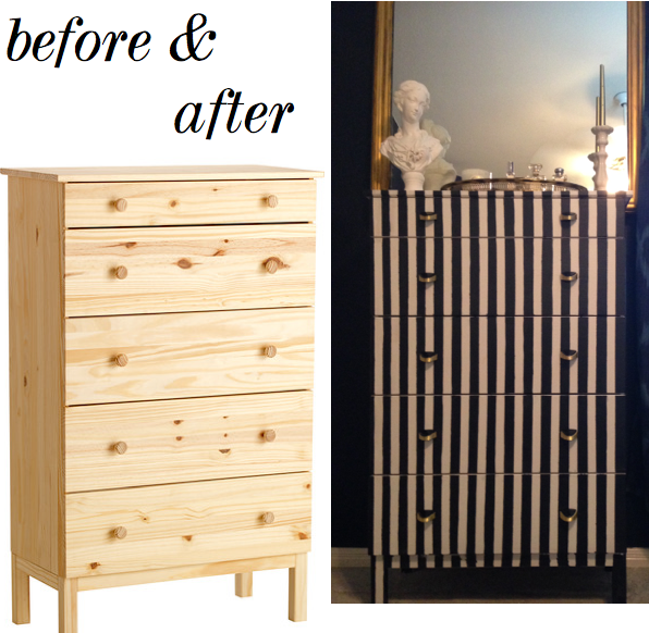 There is a LOT going on here I know, so let me break it down. We all remember the inspiration, no? Well, as I hunted around, finding the exact things I wanted didn't really work out so well so I had to improvise. Then I got inspired by a black and white striped dresser during week 3....So, I decided to stop hunting for a gorgeous antique dresser to refurbish, which upsets me because I love the quality of old pieces. I picked up the Tarva ikea dresser, because its tall and I wanted to add some height to the room. Everyone hacks ikea dressers so I thought, hey why not give it a try.(black and white stripes & chic hardware pulls) There are so many good ones, too and I wanted to do something majorly different, so I did. Here is the plan: