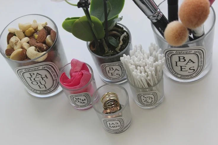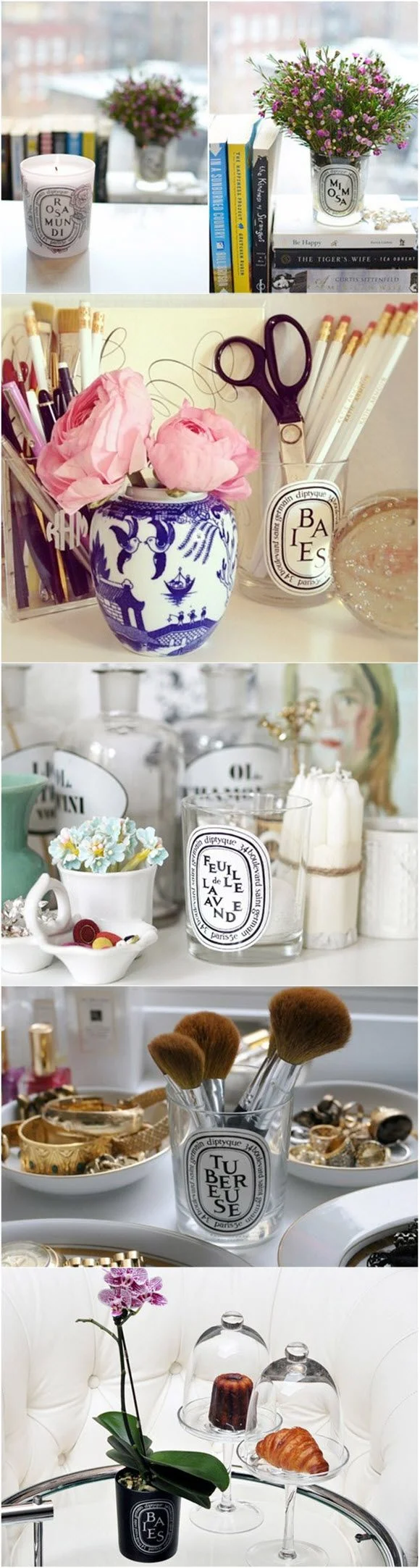 After a long week in NYC, I'm finally grooving back to the swing of things. I've got so many concepts and ideas and that I am ready to share. First of all, I am a scent-a-holic. That's right. I can't do anything without a proper smell. I've got spray for my lingerie, for my sheets and towels, I keep candles and diffusers in almost every room in my house, I have a perfume addiction and I only buy beauty products that have pleasant smells. For me, smell is everything! So, how do you translate that smell to things that are pretty to look at? I use my empty candles as flower vases, the height is always right for sweet roses. Lately, I've been seeing empty Diptyque candles in more uses than just candles and flowers. You can do so much more with beautiful empty candles. Here are a few photos to inspire you for your delightful sanctuary.