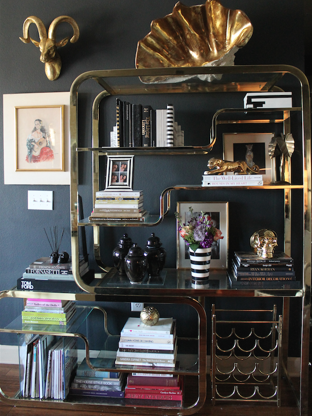 I'm still head over heels in love with my amazing Milo Baughman brass etagere (You can get this exact one here). I still can't believe I found it, and for $60. I pay so much attention to this thing, I am always restyling it and arranging new things on it to make it happy and cared for, almost like its my pet. Yes, I'm a little decoratingly weird like that. Anyway, as I am styling up my bookcase for a little feature I wanted to share a few tips on how and why I add and arrange things. You can see the BEFORE styled up bookcase here.