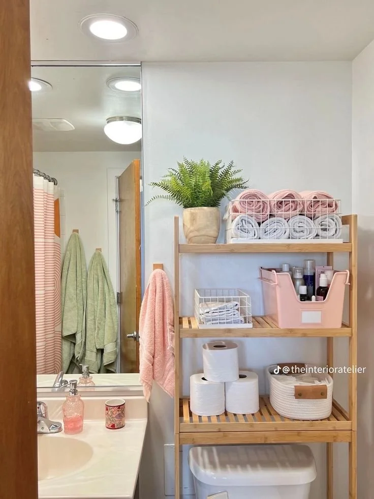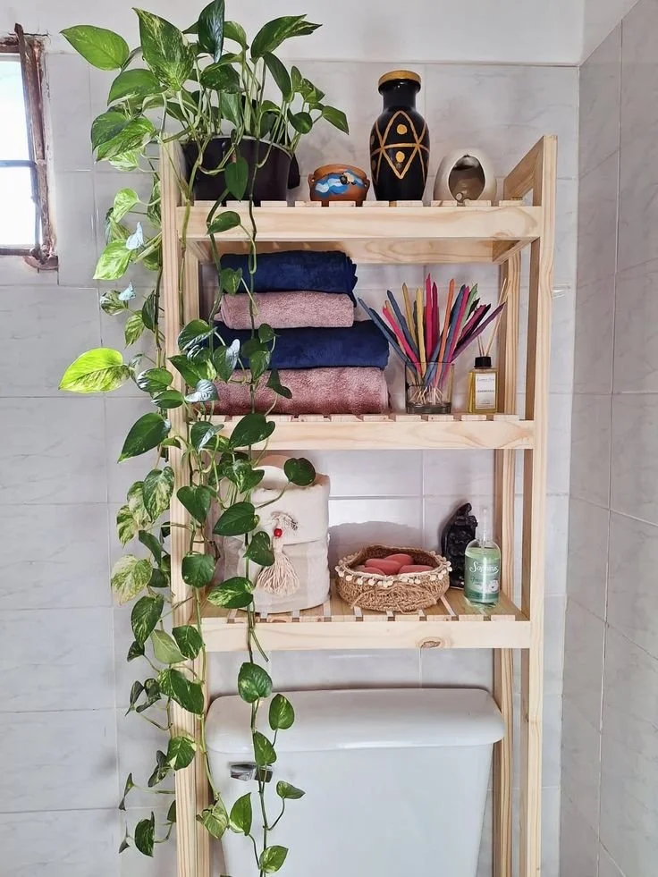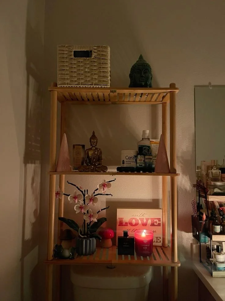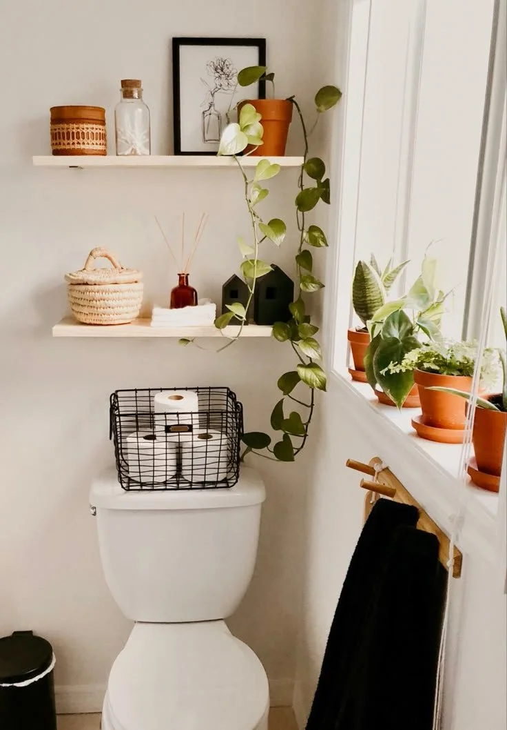 Mix decor with function: The best shelves combine practical storage (like towels or toilet paper) with decorative elements (like plants or art).