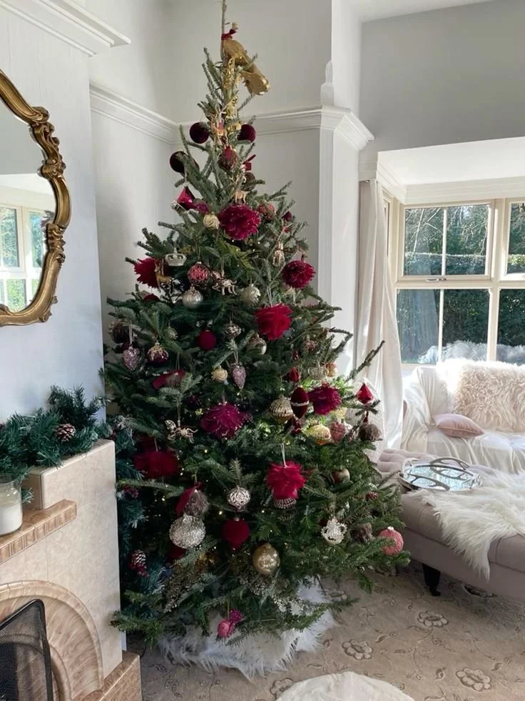 This burgundy and gold Christmas tree glows with warmth beside the fireplace, creating the ultimate cozy holiday scene. The mix of rich burgundy tones and gilded ornaments reflects the firelight beautifully, filling the room with a sense of elegance, comfort, and timeless Christmas magic.