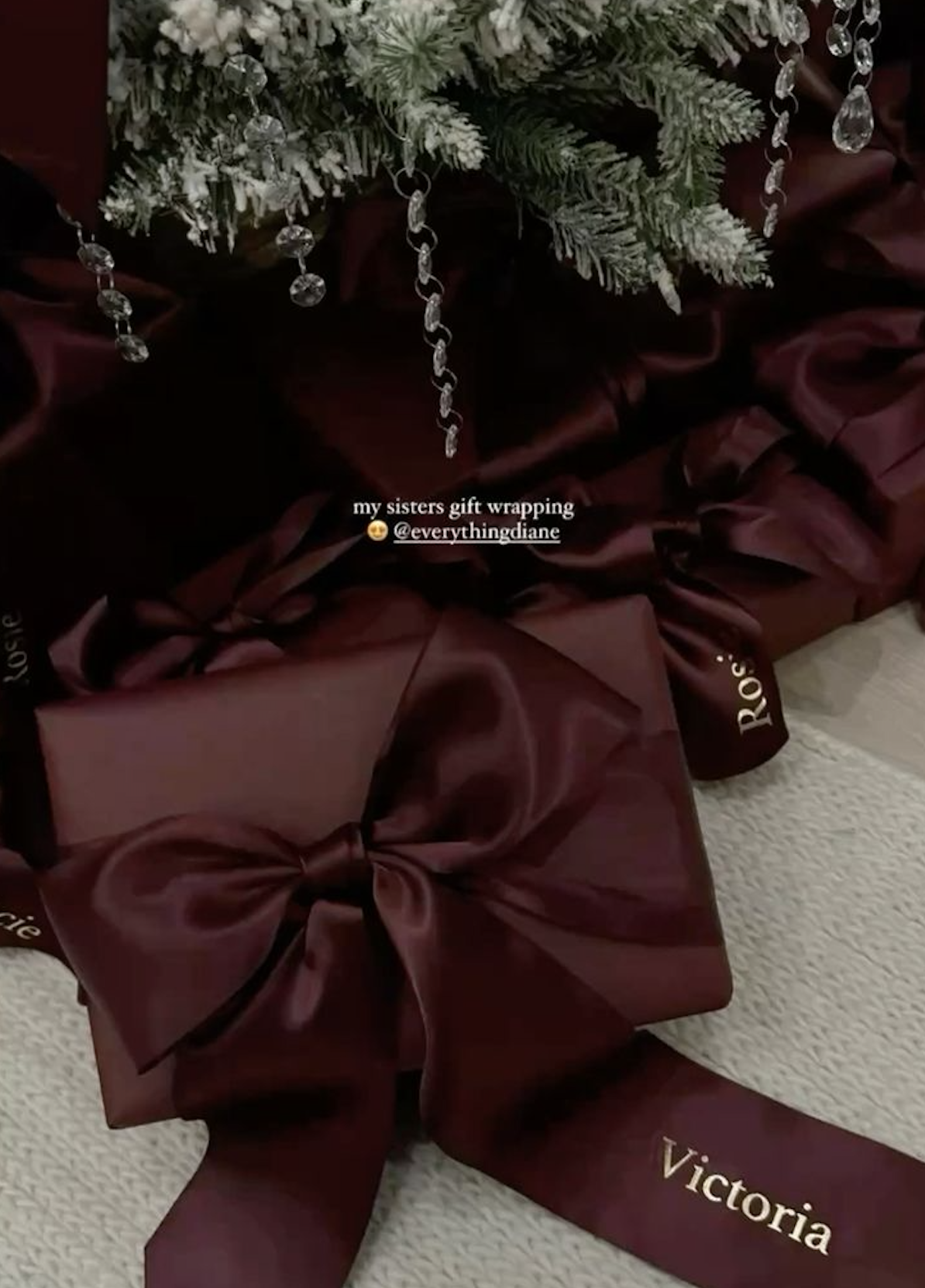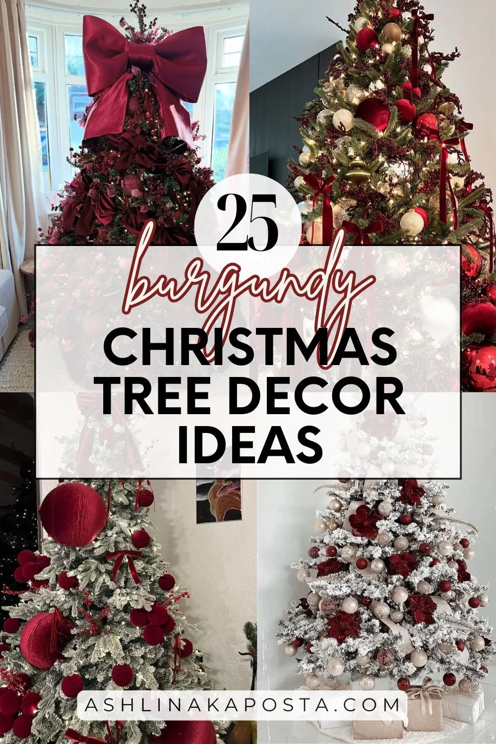 Draped in silk burgundy bows from top to bottom, this tree is the definition of understated luxury. The addition of delicate icicle ornaments adds a hint of sparkle without overpowering the soft, romantic feel. It’s a modern, chic take on the burgundy Christmas tree trend—minimal, elegant, and irresistibly stylish.