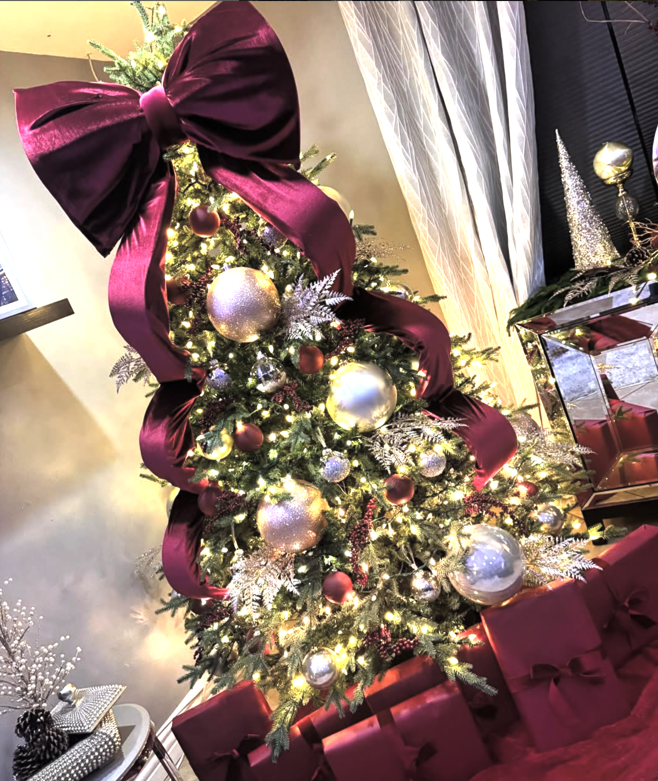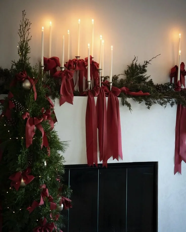 Rich burgundy ribbons flow through this space, tying the entire holiday look together—from bows cascading down the Christmas tree to matching ribbons wrapped around candles on the mantel. It’s a simple yet stunning way to create a cohesive, luxurious holiday design that feels plush, elegant, and utterly glamorous.