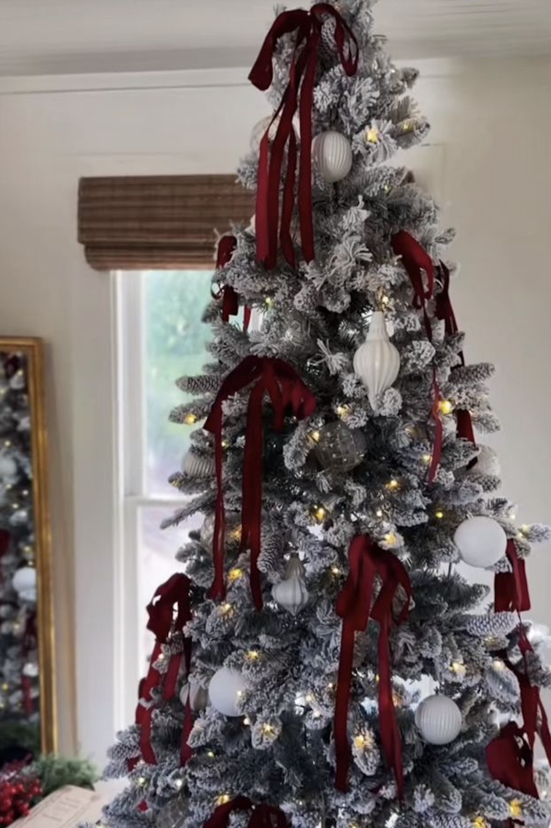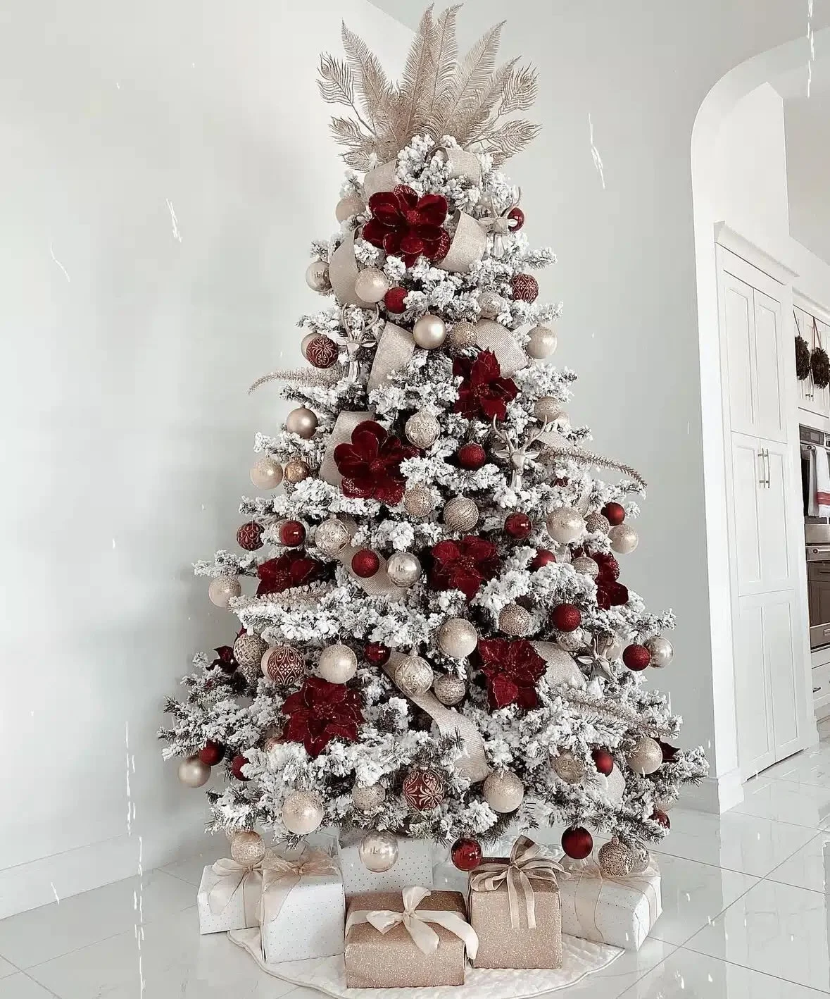 A snow-kissed flocked tree meets timeless elegance with deep burgundy bows and crisp white ornaments. The contrast of rich red tones against soft white branches feels both cozy and glamorous—like a snowy evening wrapped in velvet. It’s a stunning take on the burgundy Christmas tree trend that feels fresh yet forever classic.