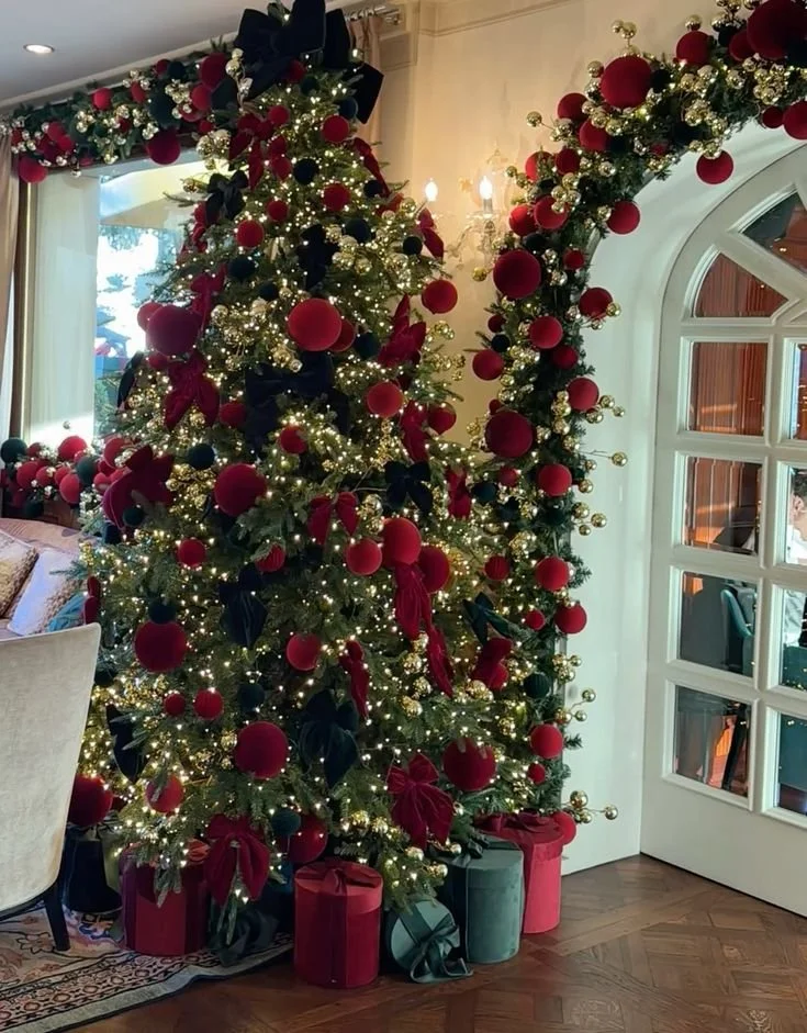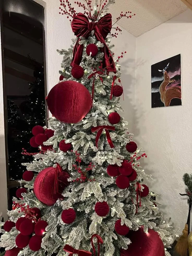 Nothing says luxury like velvet burgundy ornaments. This tree makes a bold statement by keeping it simple—plush burgundy balls covering every branch, creating a rich, monochromatic look. The texture of the velvet catches the light beautifully, giving this burgundy Christmas tree a moody, high-end glow that feels both modern and timeless.