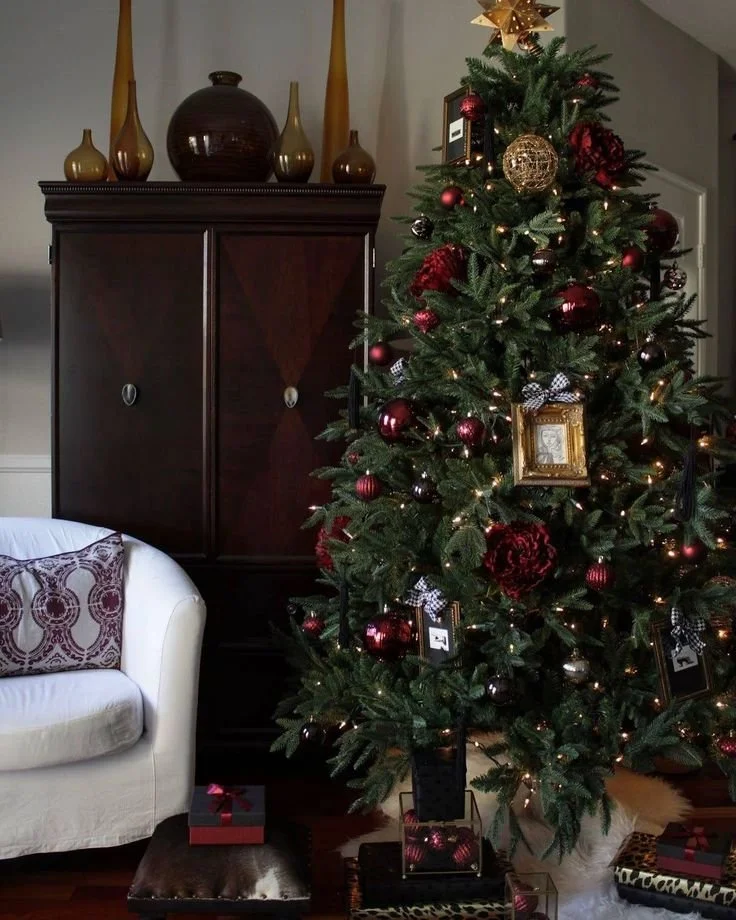 A tree that tells a story. This antique-inspired Christmas tree is dressed in layers of burgundy ornaments—from glass balls to floral details—paired with vintage-style gold picture frame ornaments and heirloom touches. The result is a nostalgic, old-world glamour look that feels straight out of a Ralph Lauren holiday catalog.