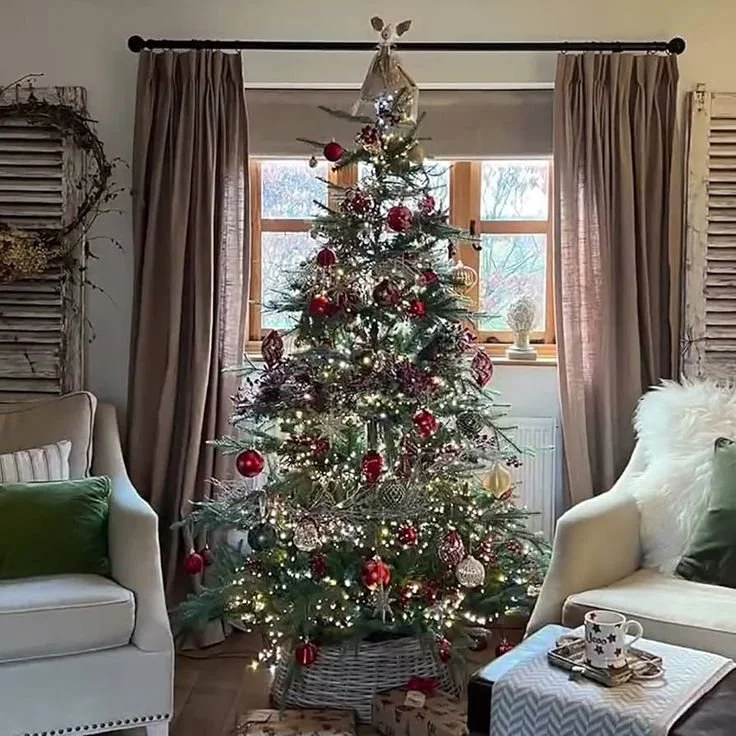 Ground your tree with a beautiful tree skirt or woven basket base that complements your palette. A faux fur tree skirt or a rich velvet wrap in burgundy or gold ties the entire look together and gives that final touch of refinement.