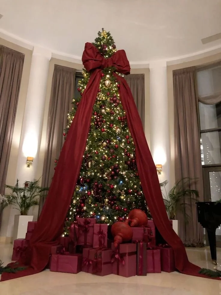 This showstopping burgundy Christmas tree features a dramatic oversized bow at the top, with velvet ribbons cascading gracefully down through the branches. It’s the perfect way to create that glamorous, designer-style holiday look—bold, elegant, and beautifully tied together with one luxurious statement piece.