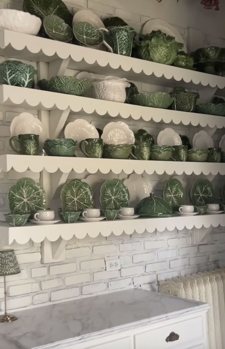 Open shelving is a beautiful way to showcase a growing cabbage ware collection. By layering different pieces—plates, bowls, serving dishes, and pitchers—you can create a display that feels abundant and full of texture.