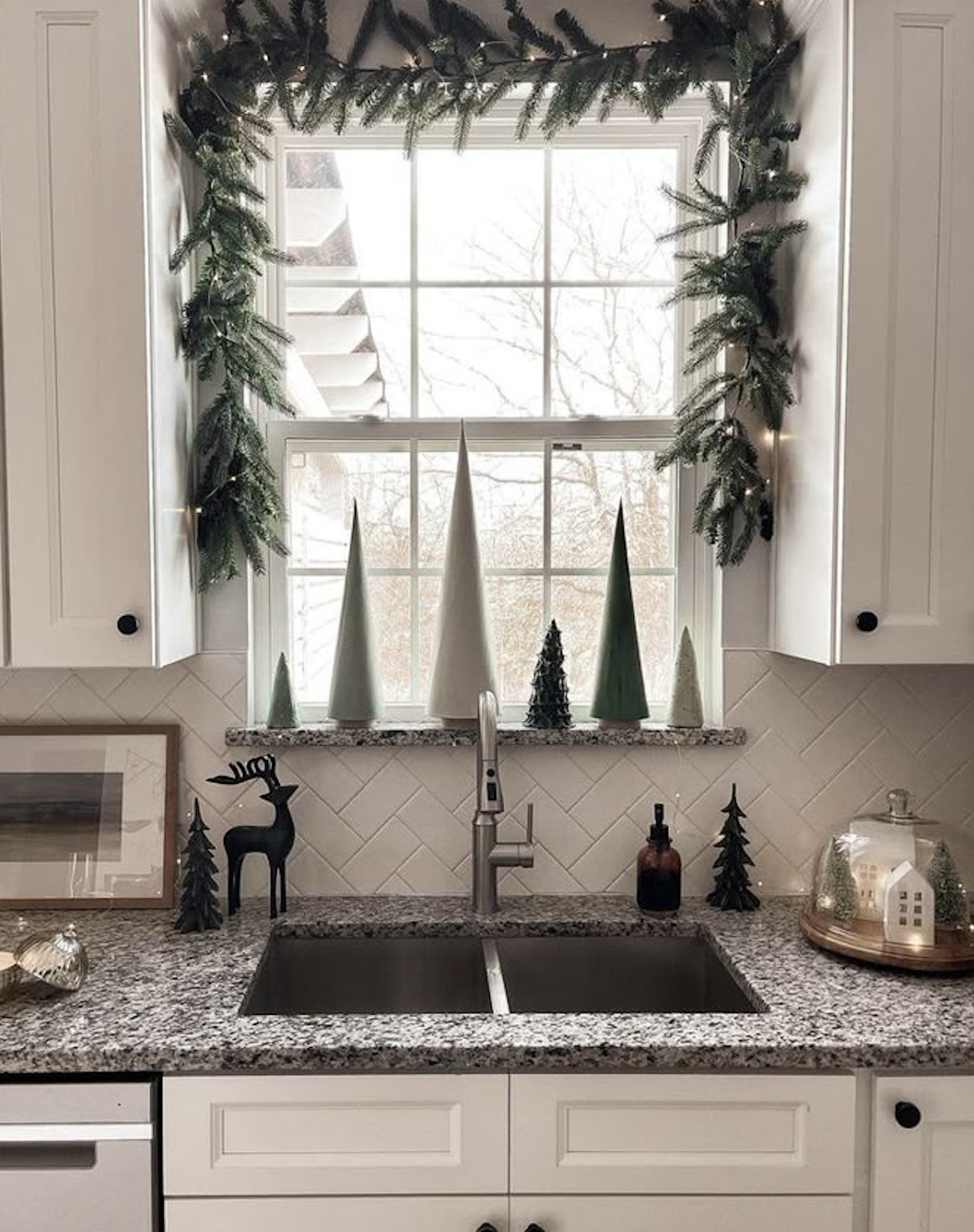 Gorgeous garland or a small pine wreath hung in the kitchen window adds a natural touch that feels both fresh and Christmassy. A bit of faux snow or ribbon elevates the look without overwhelming your counter.
