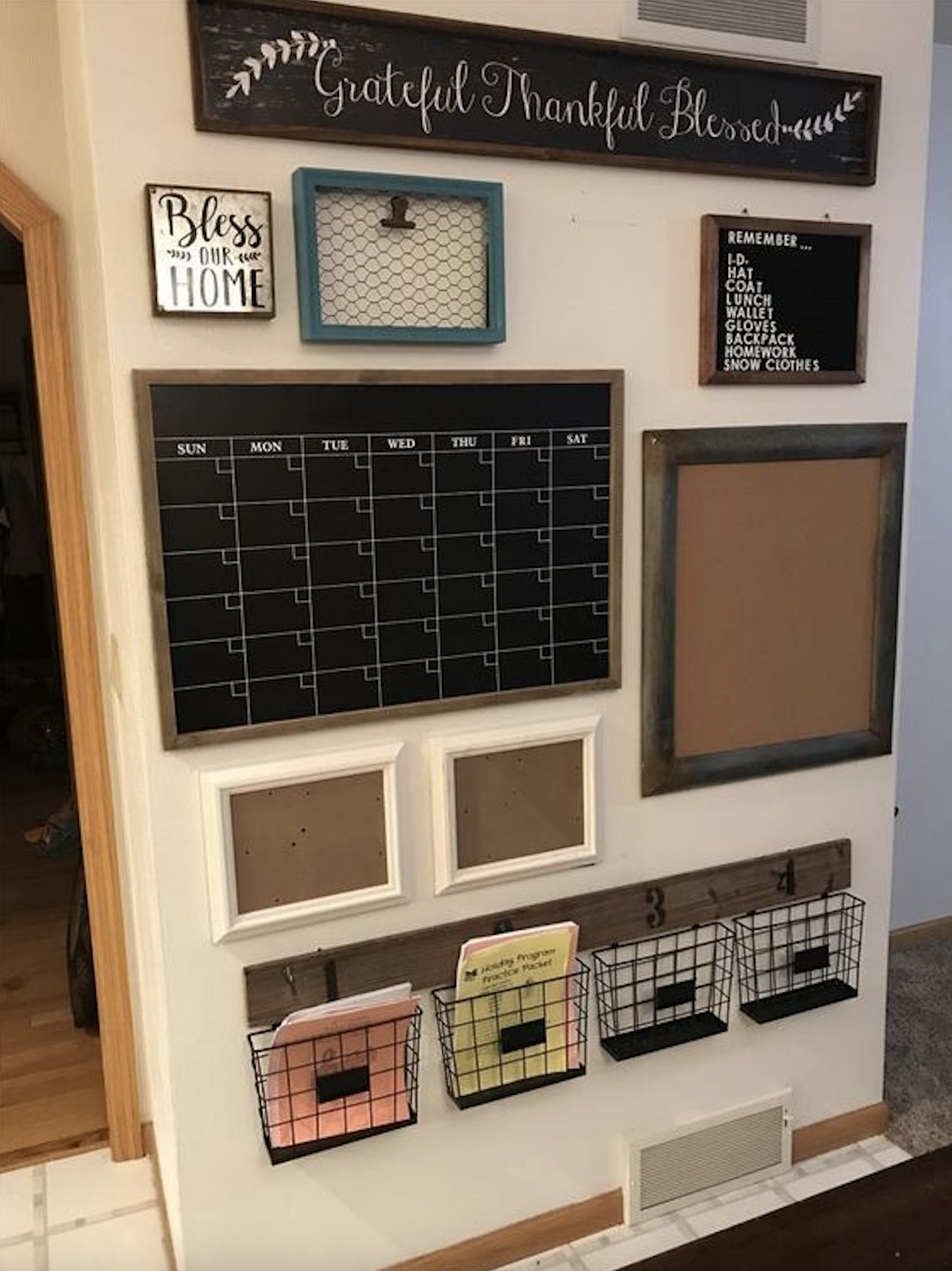 Use a large wood chalkboard wall calendar and personalized wire hanging baskets to help corral the miscellaneous family items.