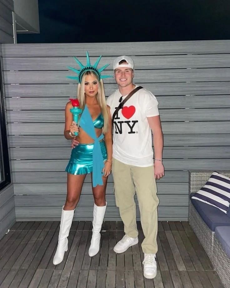 A costume that’s both patriotic and playful, this duo is perfect for couples who love New York. For Lady Liberty, go bold with a metallic green or teal dress (or even a two-piece set), a spiked crown headband, and a torch prop to complete the iconic look. White boots or metallic accessories can really elevate the vibe.