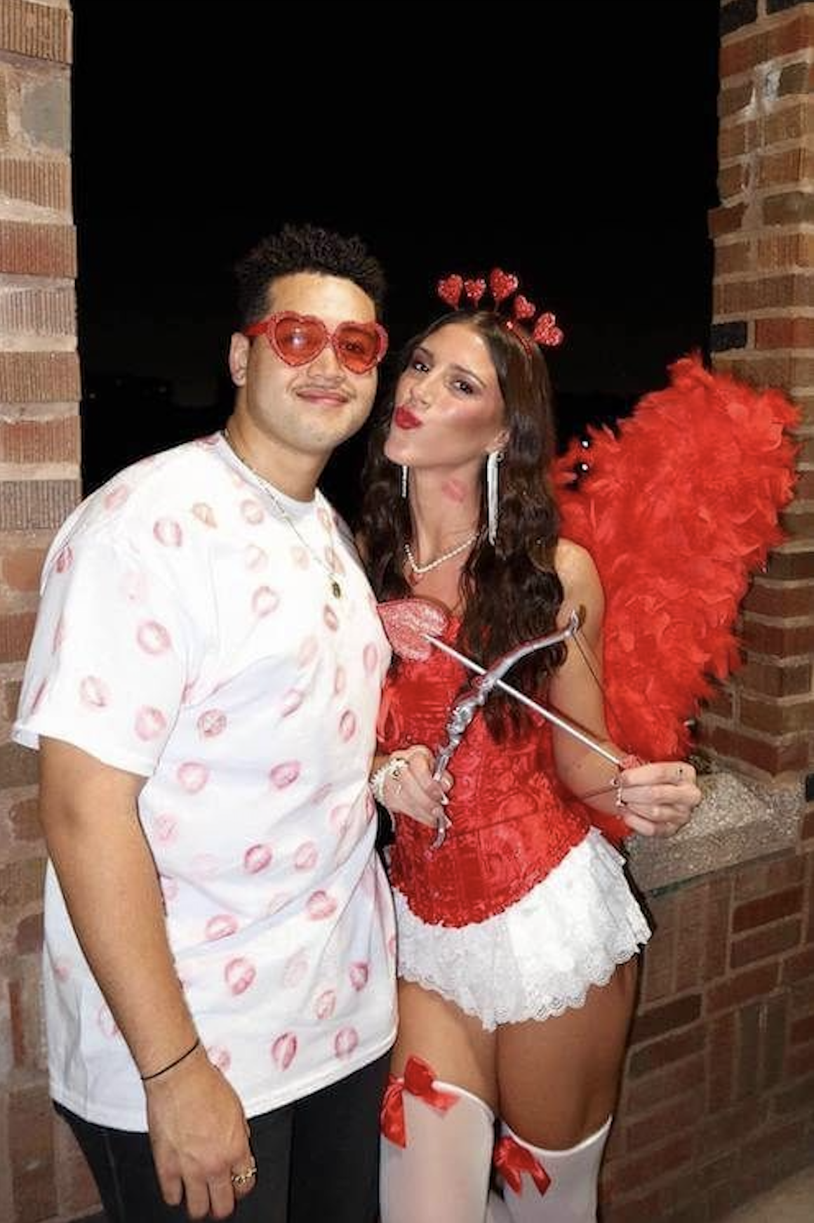 Her partner (the “love”) can keep it simple but clever with a shirt covered in lipstick marks, heart-shaped sunglasses, and accessories that show he’s been struck by Cupid’s arrow.