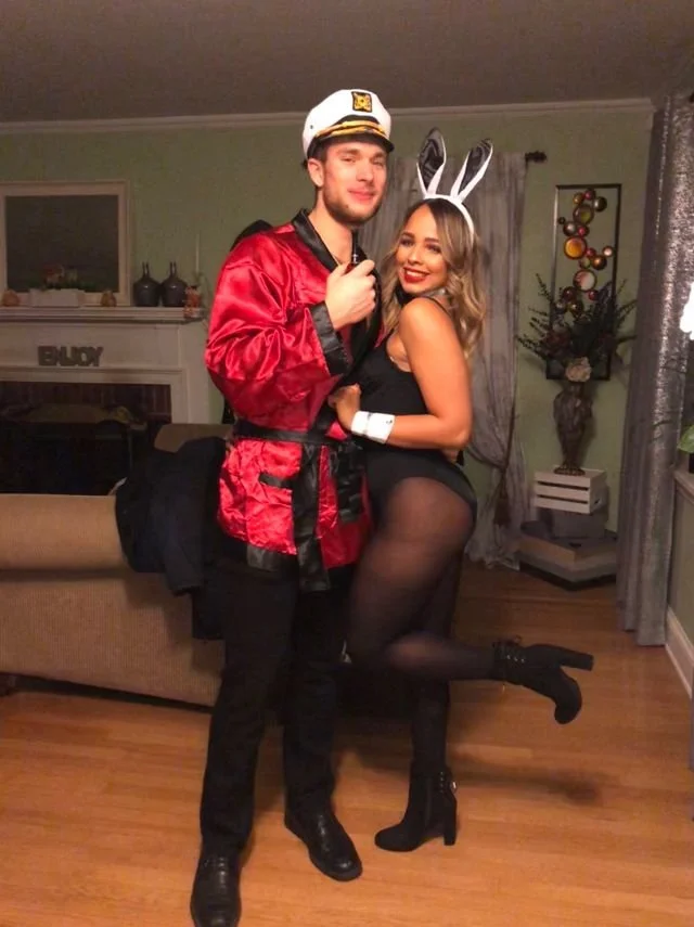 If you want a costume that’s equal parts glamorous and cheeky, Hugh Hefner and a Playboy Bunny is a timeless choice. For Hugh, all you need is a silky red robe, black pants, slippers, and his signature captain’s hat (a cigar prop is optional but adds to the effect).