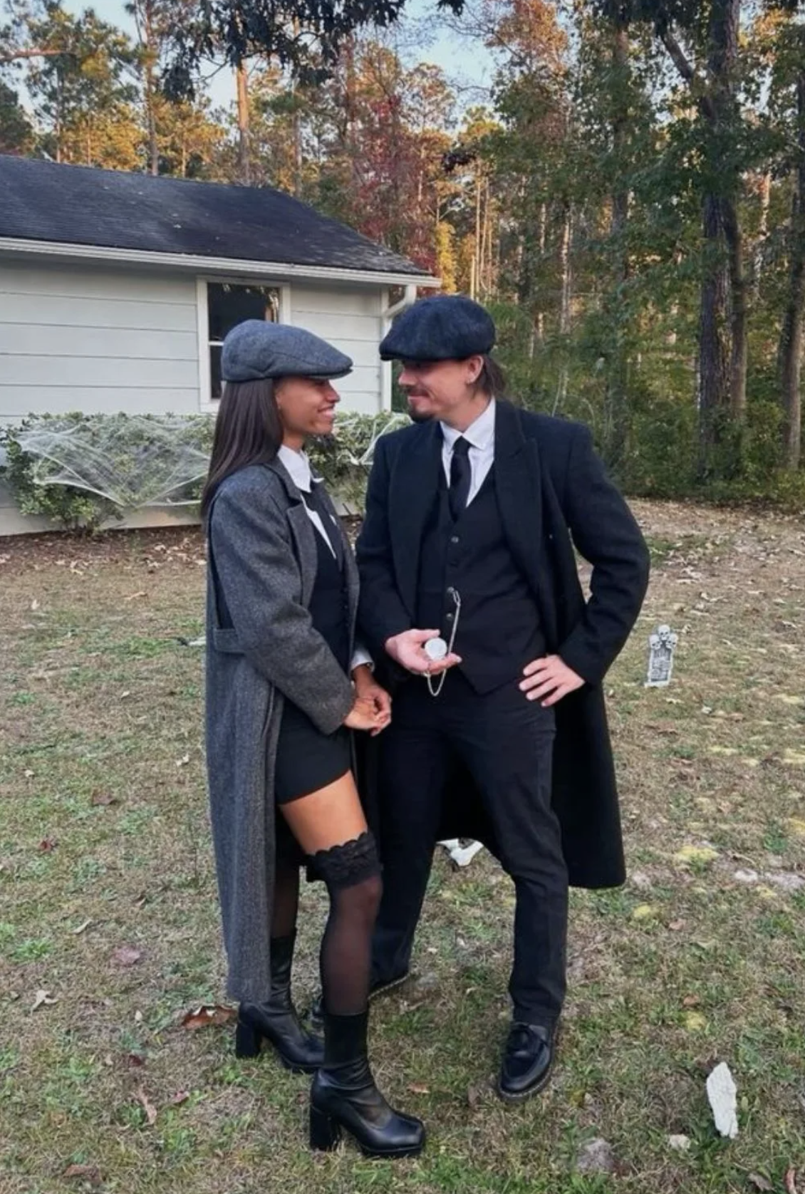 For couples who love a darker, more dramatic vibe, channeling the Shelby family is a brilliant idea. Tommy Shelby’s look is all about sharp tailoring and grit: a three-piece suit, long overcoat, pocket watch, flat cap, and of course a prop cigarette. Don’t forget to keep a serious expression—his brooding presence is part of the character.