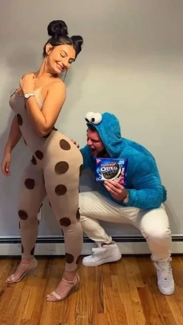 This sweet duo is guaranteed to be a crowd favorite. One partner can dress as Cookie Monster with fuzzy blue attire (a hoodie, tutu, or onesie works great), googly eyes on a headband or hat, and a stash of cookies as props. The other goes as the cookie itself—think a round cut-out costume, a brown dress with felt “chocolate chips,” or even a shirt decorated with cookie patterns.