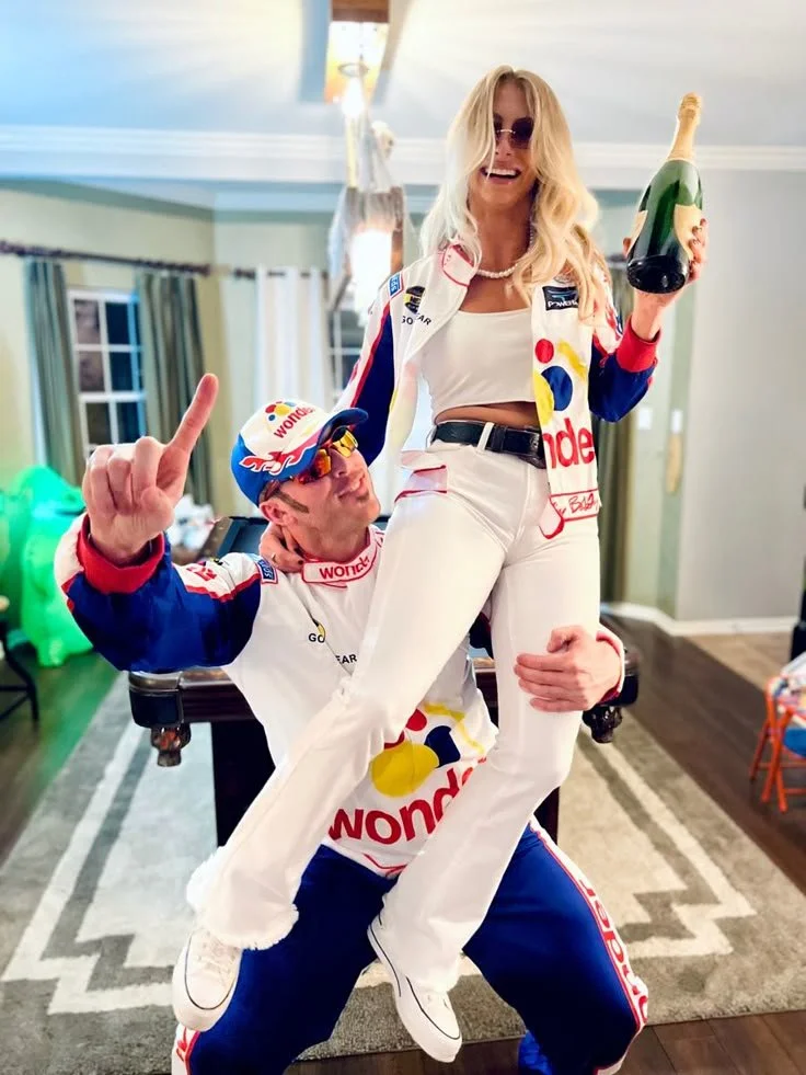 His partner can lean into the NASCAR vibe with a coordinating outfit—think a pit crew look, a chic “trophy wife” glam moment, or even a matching branded jacket. Champagne or checkered flag props make the look even better.