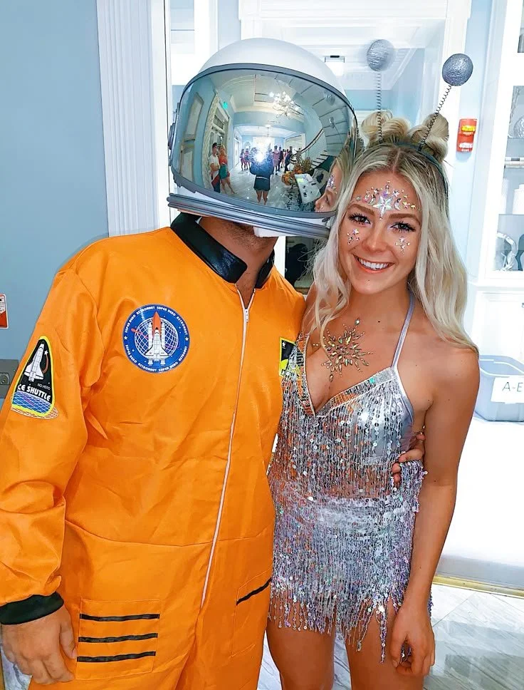 The best way to pull this one off is to play with your dynamic: the astronaut “exploring” and the alien dazzling with otherworldly sparkle. Together, you’ll stand out as the ultimate space-age duo ready to win any costume contest.