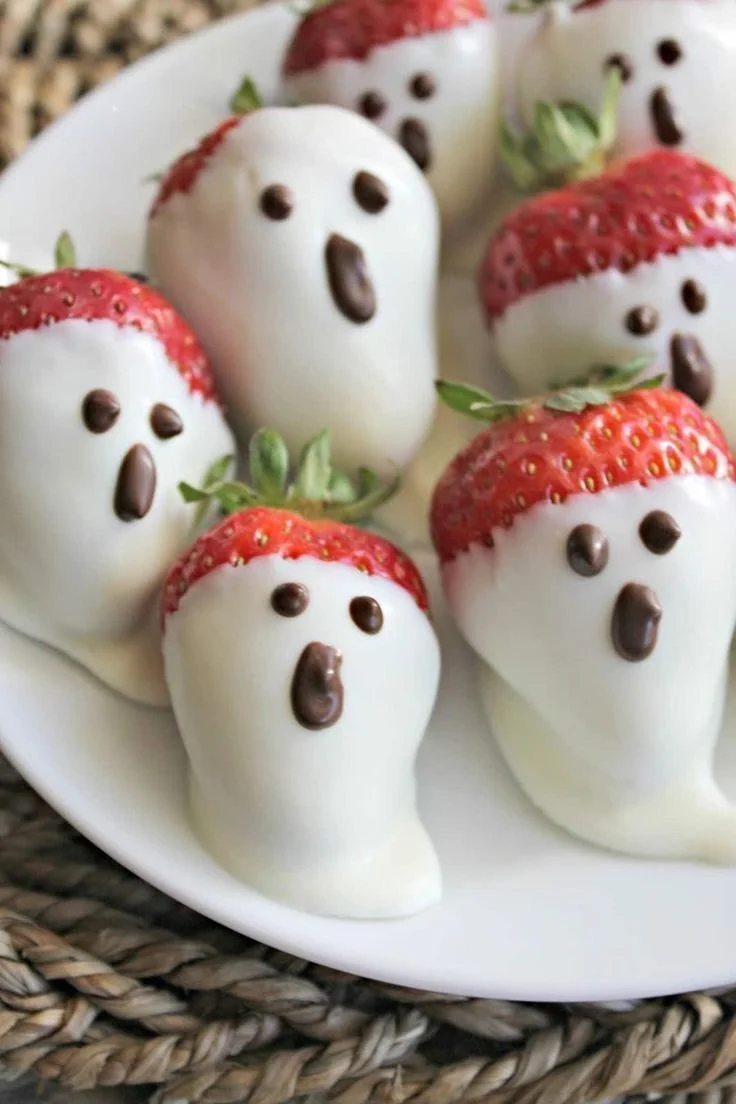 These ghost strawberries are the sweetest (and simplest) Halloween dessert you’ll ever make. Fresh strawberries are dipped in melted white chocolate and dotted with mini chocolate chips for the eyes and mouth. The result? A perfectly spooky, slightly silly treat that everyone will love — and they look gorgeous displayed on your dessert table.