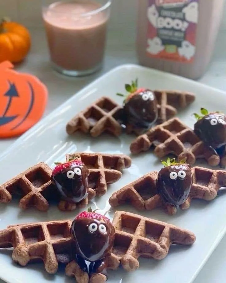 Here’s a Halloween breakfast (or dessert!) idea that will make your kids squeal with delight and impress every guest at your spooky gathering. These adorable bat waffles are so easy to make — just slice your waffles into wing shapes, add chocolate chips for eyes, and finish with fresh strawberries for a pop of Halloween color. They’re playful, festive, and a total show-stopper on any breakfast table or Halloween brunch spread.