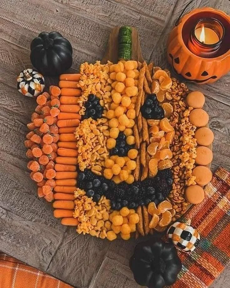 This pumpkin snack board is proof that healthy and festive can absolutely go hand in hand. Made entirely of orange-colored snacks — think carrots, clementine slices, cheddar cubes, goldfish crackers, and orange bell peppers — it forms the perfect pumpkin shape on your serving board. It’s bright, cheerful, and a total crowd-pleaser for both kids and adults.