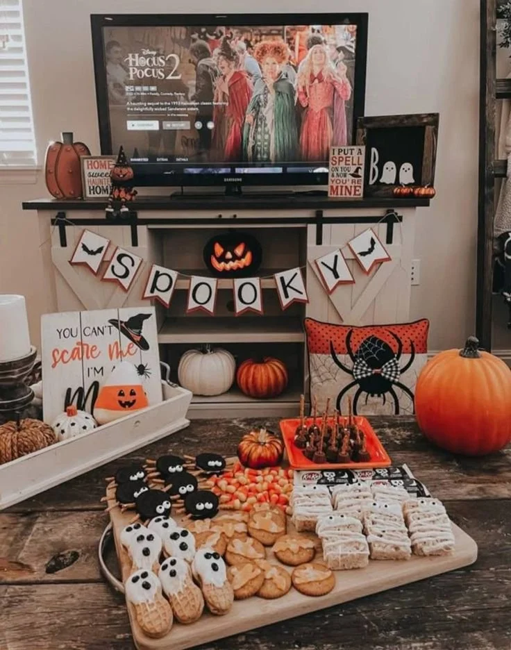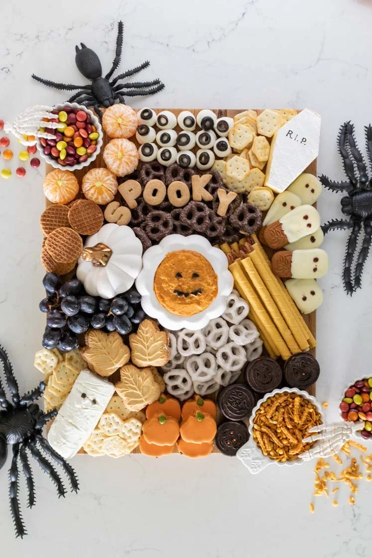 Keep the color palette warm and autumnal — oranges, browns, and whites with pops of black. Use small cookie cutters to shape your foods, and add a few Halloween props like spider rings, pumpkin picks, or cobweb napkins to tie it all together. Serve alongside pumpkin spice lattes or apple cider for that full cozy fall feel.