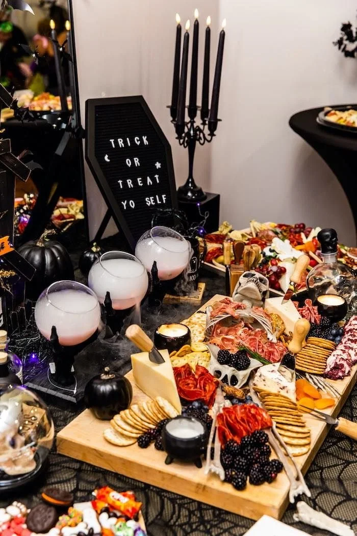 Turn your Halloween grazing table into a spooky masterpiece with a skeleton charcuterie board. Arrange meats, cheeses, fruits, and crackers around a life-size or mini skeleton to create a hauntingly beautiful display that’s as creepy as it is delicious. It’s the perfect balance of elegant and eerie — ideal for an adult Halloween party or a statement centerpiece at any spooky gathering.