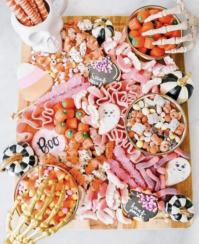 When it comes to Halloween entertaining, there’s no such thing as too much candy. This Halloween candy charcuterie board is the sweetest way to serve up your spooky-season treats. Pile on chocolates, candy corn, gummies, and lollipops in festive orange, black, and white hues — the trick is in the styling. Arrange your candies by color and texture for that polished, Pinterest-perfect look that still feels playful and fun.