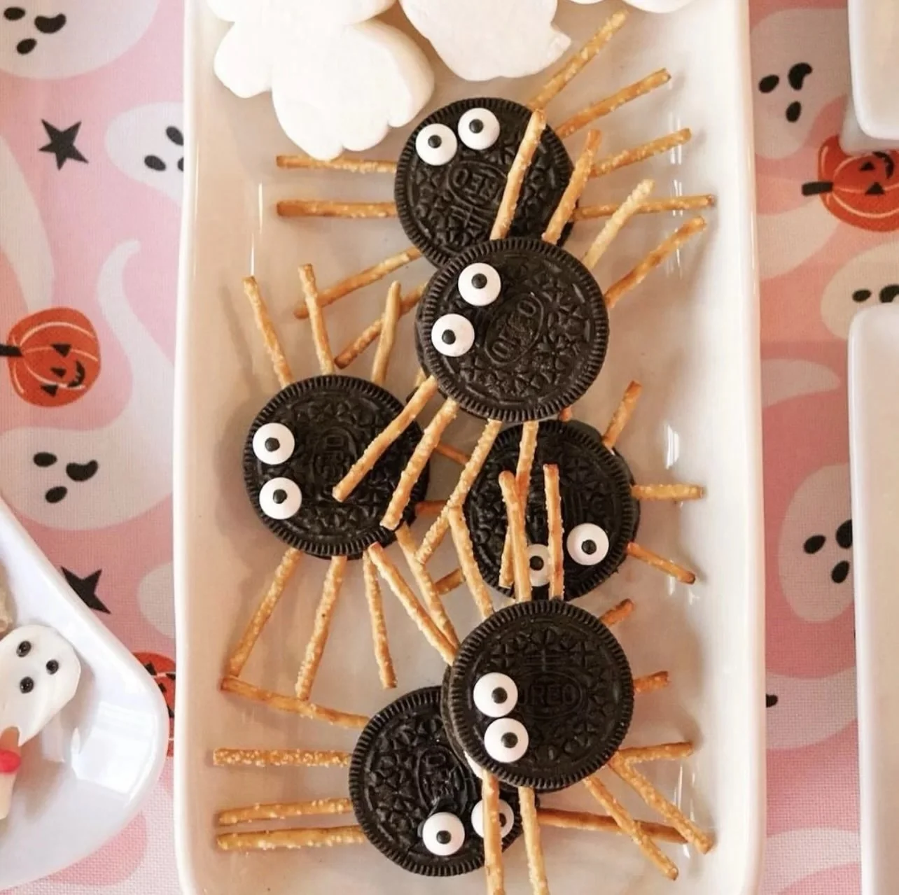 Use mini Oreos for bite-sized versions or double-stuffed for extra sturdiness when adding the legs. Want to level them up? Dip the edges in melted chocolate and roll in Halloween sprinkles before adding the eyes. Display them on a black tray or in a web-patterned bowl for that perfect Halloween look.