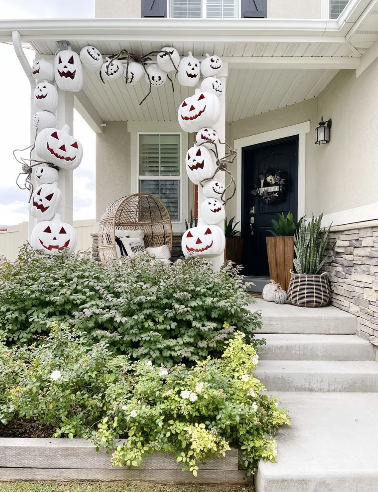 I love the simple look of this all white pumpkin face lantern collection. I found a bunch of adorable and affordable pumpkin lanterns. Grab some white spray paint and spray them all so they look cohesive and chic.