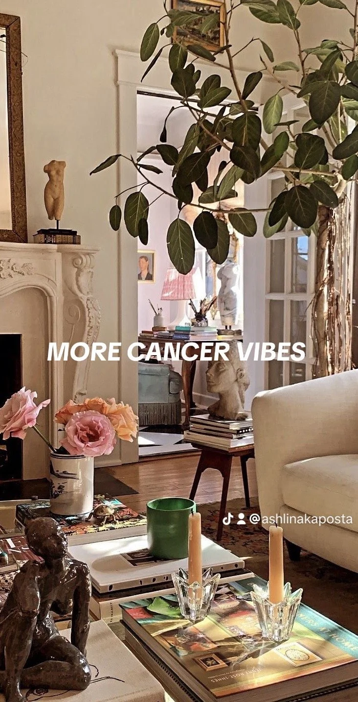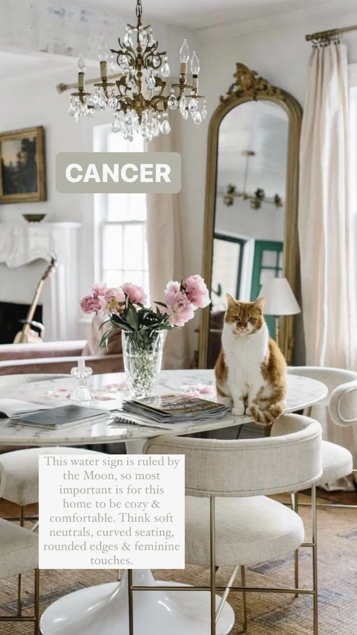 Nurturing and sentimental, Cancer values spaces that evoke a sense of security and emotional connection. Incorporate soothing colors, sentimental objects, and cozy corners for quiet reflection and relaxation. Think fluffy, cotton furniture that embraces you, curved lines, round furniture and feminine details.