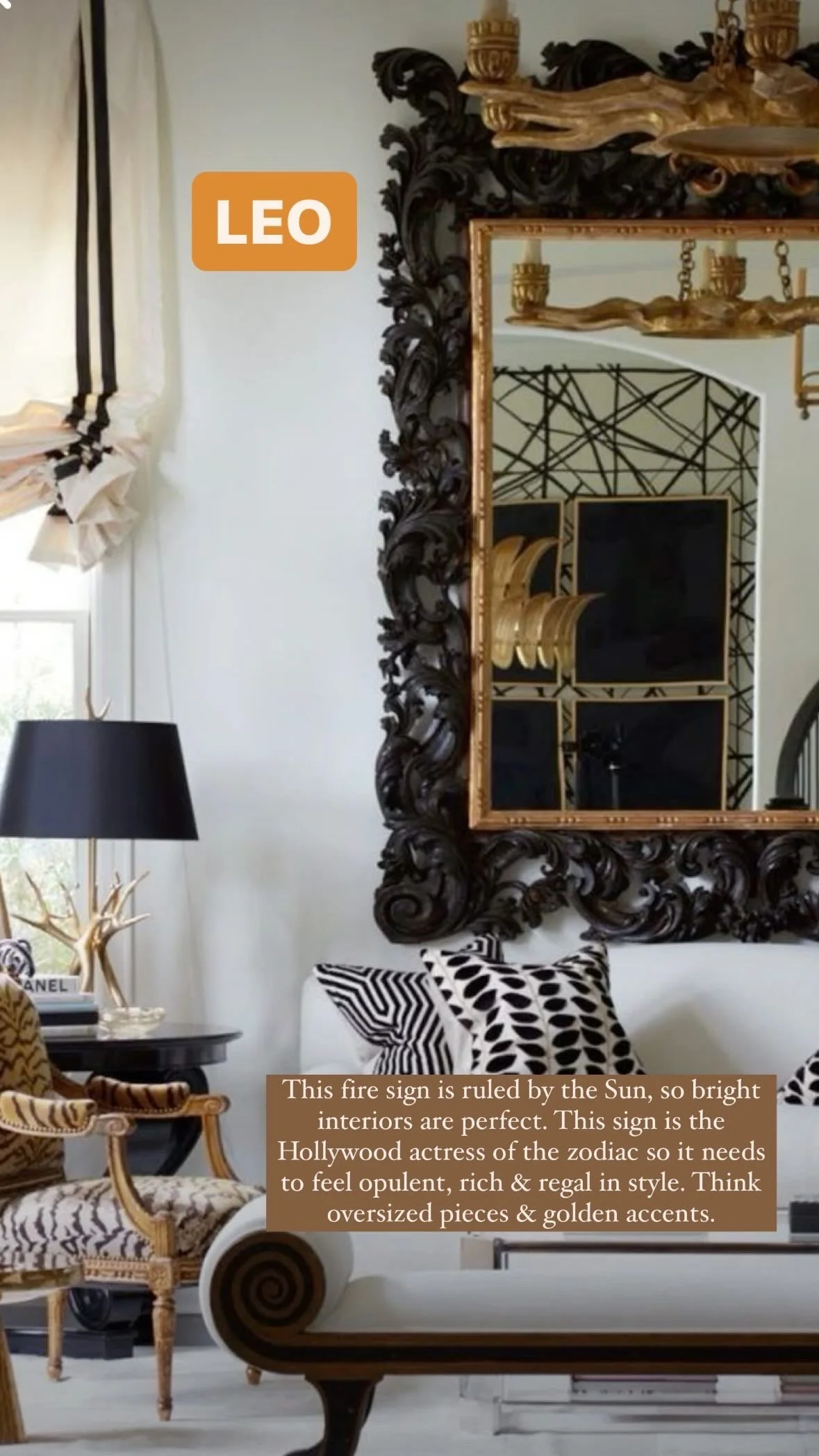 Regal and dramatic, Leo thrives in spaces that reflect their larger-than-life personality. Opt for bold colors, luxurious textures, and statement pieces that command attention and showcase their royal flair. Think gold accents and larger than life mirrors and furnishings.