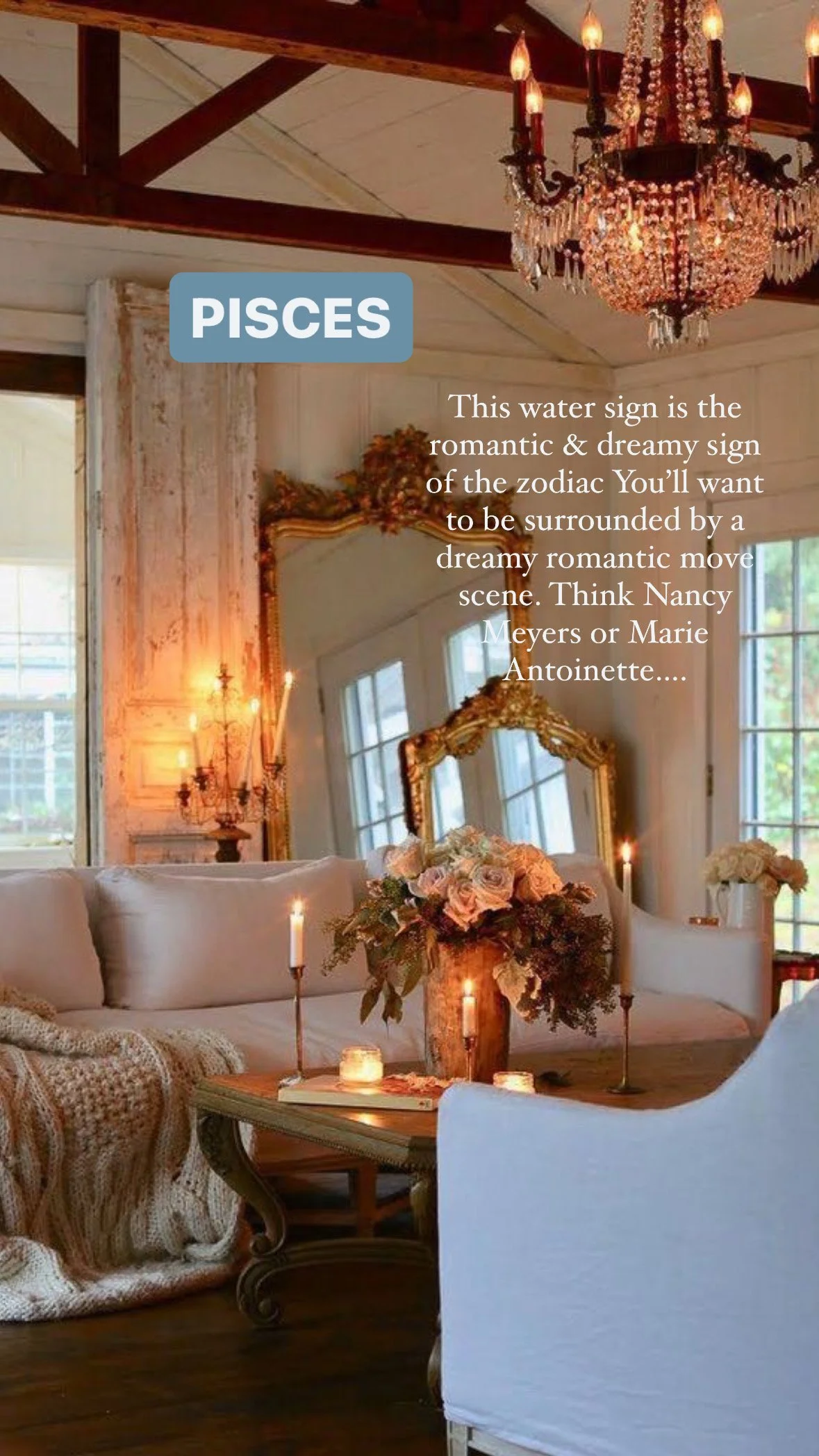 Dreamy and empathetic, Pisces seeks spaces that evoke a sense of serenity and escapism. Incorporate soft colors, flowing fabrics, and ethereal décor to create a tranquil sanctuary that nurtures their sensitive soul. Think Nancy Meyers movie set or even a film series like Bridgerton.