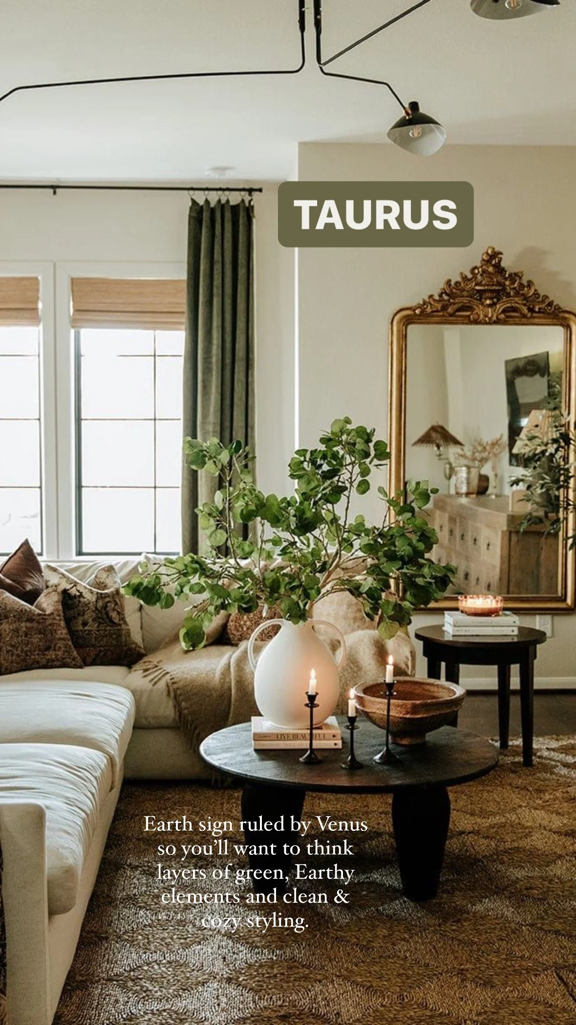 Grounded and sensual, Taurus gravitates towards earthy tones, luxurious textures, and comfortable furnishings. Focus on creating a cozy, inviting atmosphere with plush rugs, soft fabrics, and natural elements.