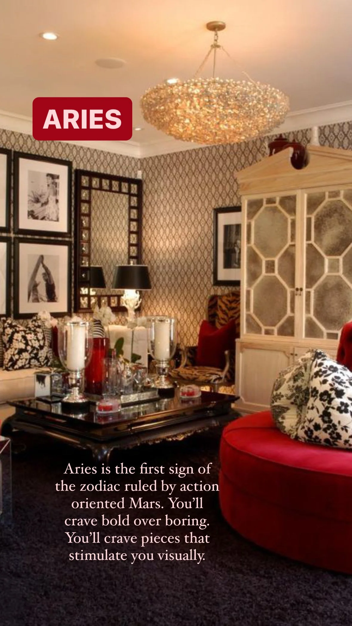 Bold and adventurous, Aries thrives in spaces that reflect their dynamic energy. Incorporate vibrant colors, statement pieces, and bold patterns to stimulate their senses and ignite their passion for life. You don’t have to decorate with the color red but think colors that feel warm and fiery. You will also want to make sure you light candles and/or the fireplace to feel more cozy.