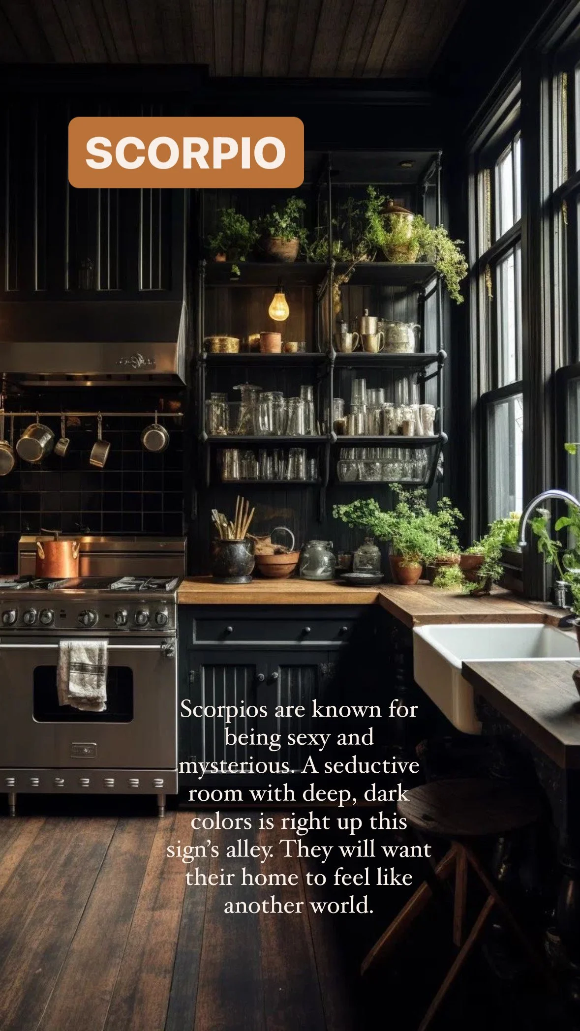 Intense and mysterious, Scorpio is drawn to spaces that exude depth and sensuality. Embrace rich colors, luxurious fabrics, and moody lighting to create an atmosphere of intrigue and allure. Pluto rules this sign and will need to feel like their home transports them to another world or time. Think about bringing in antique collections, metaphysical accessories and mysterious trinkets.