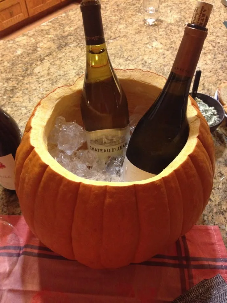 Using a pumpkin as a wine bucket is a festive Friendsgiving hack that’s both functional and a total conversation starter. Simply choose a large pumpkin, cut off the top, and hollow it out, then place a bowl or clear plastic liner inside to hold ice.