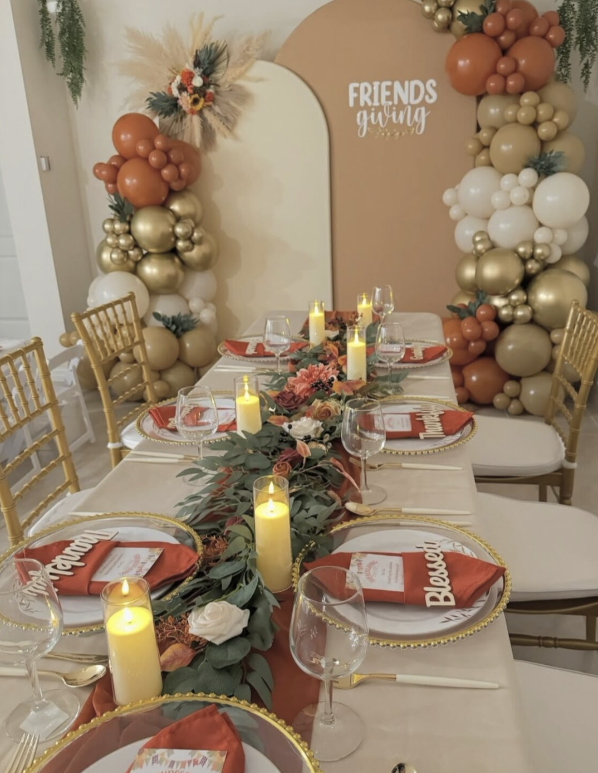 Friendsgiving is all about connection—gathering your favorite people, sharing good food, and creating memories that feel warm long after the night ends. Whether you go big with a balloon arch, keep it cozy with a picnic, or add charming touches like pumpkin place cards and edible drink garnishes, it’s the little details that make the celebration truly special.