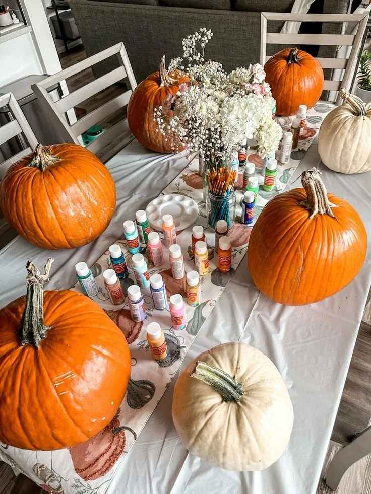Add some inspo cards or simple stencil designs for those who want guidance, and don’t forget a disposable tablecloth for easy cleanup. This low-pressure, high-fun activity doubles as festive decor—guests can take their painted pumpkins home as a sweet, seasonal keepsake from the night.