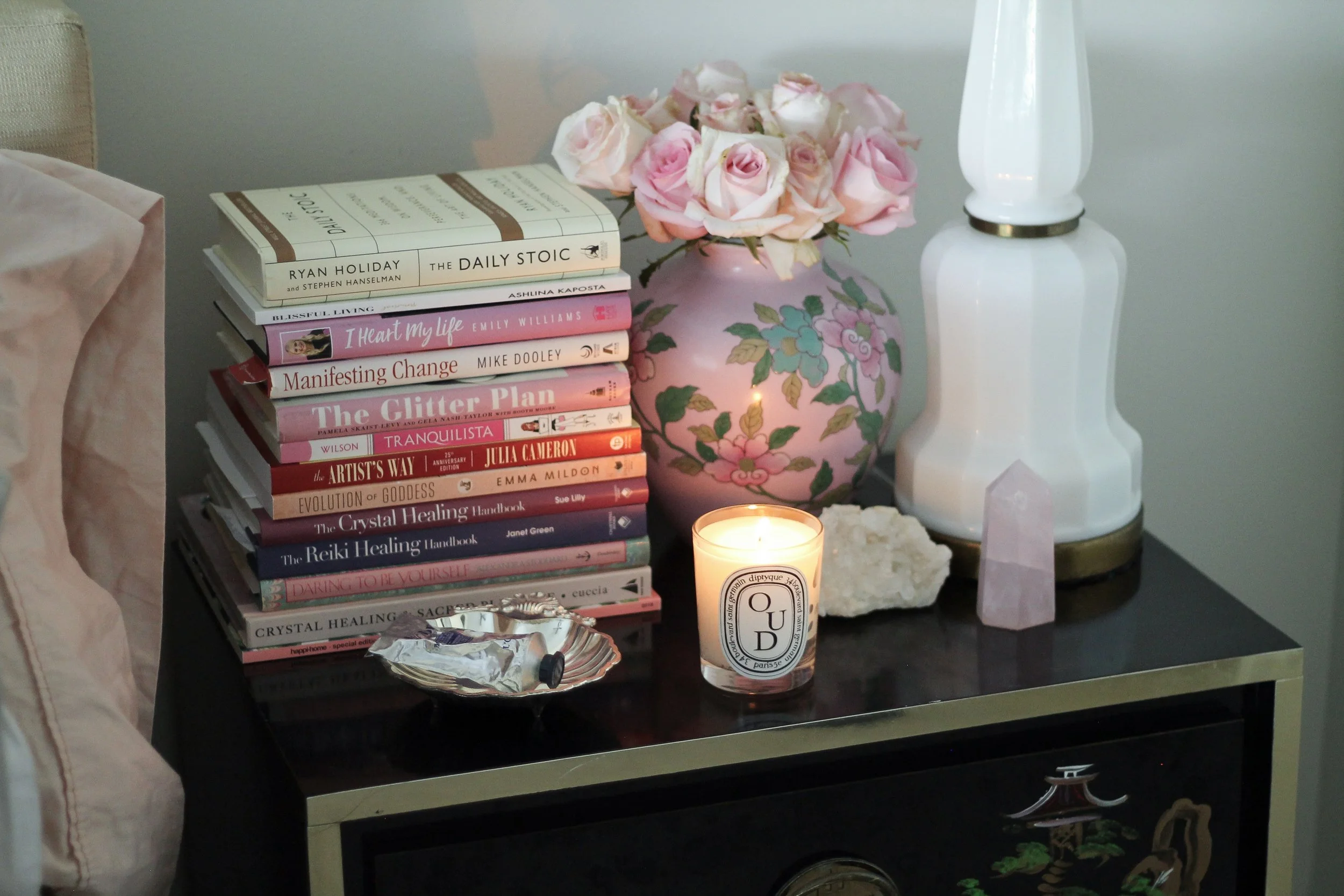 I added things that gave it my personal touch for joy. When you surround yourself with things that make you smile, it enhances your life experiences and calms you. My favorite vintage pink vase with blush pink roses totally sparks joy. I also always keep a rose quartz crystal on my nightstand because it is supposed to help you have deeper, clearer dreams. Rose Quartz also enhances your self love and romantic love so keeping it by your bed will infuse more of that loving energy. When you add a personal touch to your nightstand, you are expressing to the world, the things that are the most meaningful to you. Allow the process to be fun and flowy, your nightstand should make you happy, nobody else. This helps you to feel more yourself when you get ready for bed at night, which is the most comforting feeling in the world. Bliss Vibes Only, am I right?