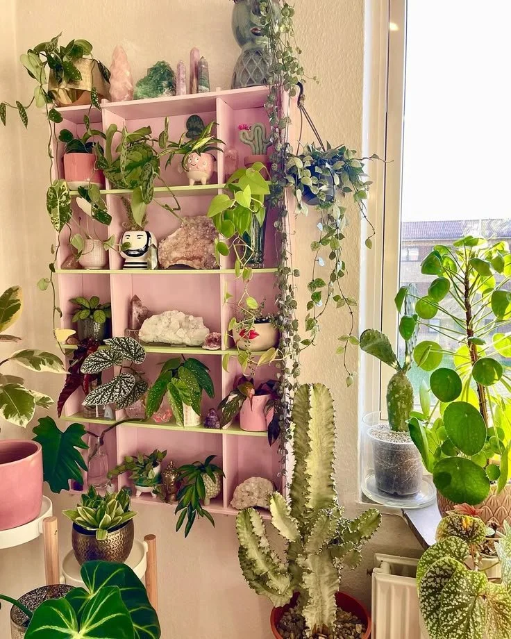 A small wall-mounted display shelf can be a beautiful way to turn crystals and spiritual objects into both meaningful decor and a sacred space in your home. In this example, a cubby-style shelf is filled with crystals, small plants, and decorative objects, creating a layered display that feels vibrant and alive. The soft pink shelving adds warmth while the greenery cascading from the shelves brings movement and natural energy into the arrangement. Crystals placed throughout the compartments create small focal points that make the entire shelf feel intentional and thoughtfully curated.