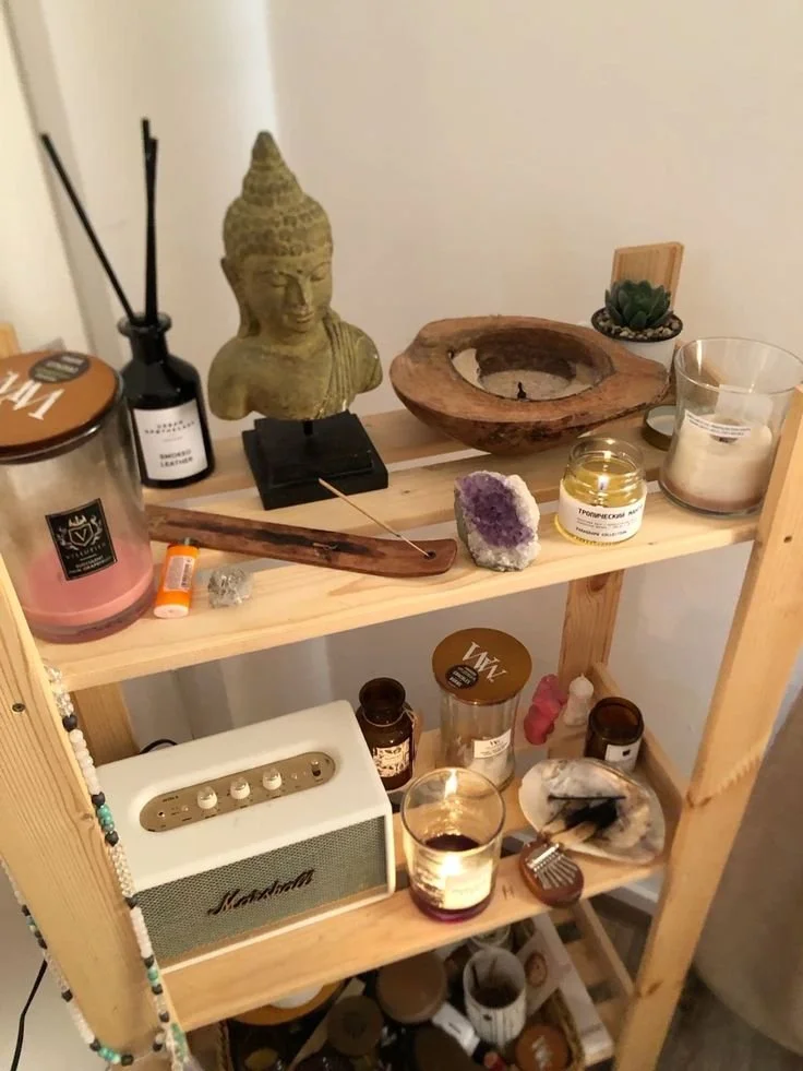 The layered shelves allow space for different ritual tools, such as incense holders, cleansing bowls, candles, and meaningful objects that support meditation or quiet reflection. To recreate this style of altar, choose a small shelf or corner table and place a central object that represents peace or spiritual connection, like a statue, crystal cluster, or candle. Then add supporting elements such as incense, crystals, or small bowls to create a space that feels personal, calming, and easy to return to whenever you need a moment of stillness.
