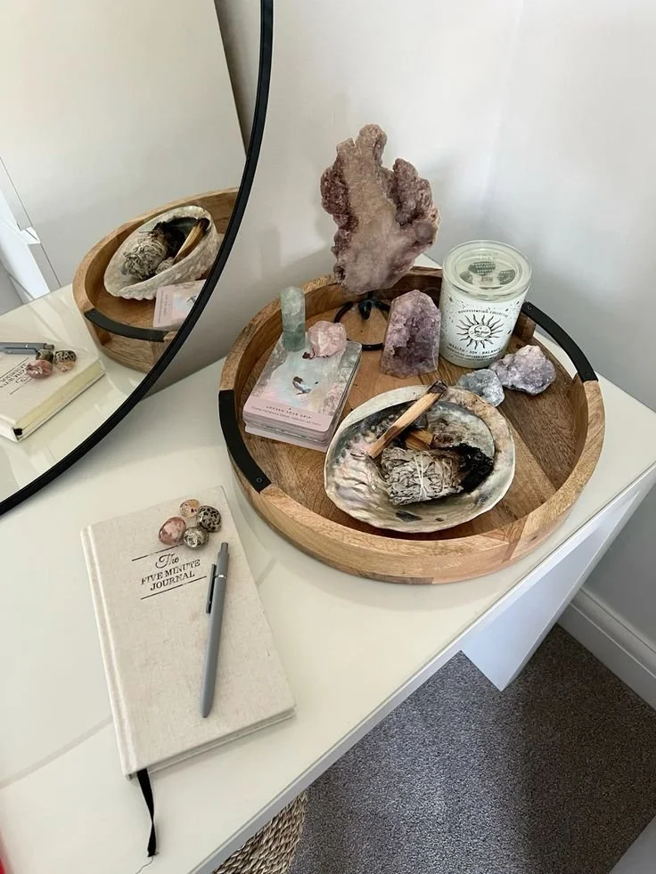 A vanity is actually a wonderful place for a spiritual or crystal altar because it’s already a space where many people practice daily rituals like skincare, journaling, or getting ready for the day. To recreate a similar altar, start with a tray or small surface on your vanity and layer in a few meaningful objects—crystals, candles, a small bowl, or even a favorite perfume bottle. The mirror will reflect the candlelight and make the altar feel warm and inviting. Over time, this small arrangement can turn an everyday routine into a mindful ritual that helps you start or end your day feeling grounded and centered.