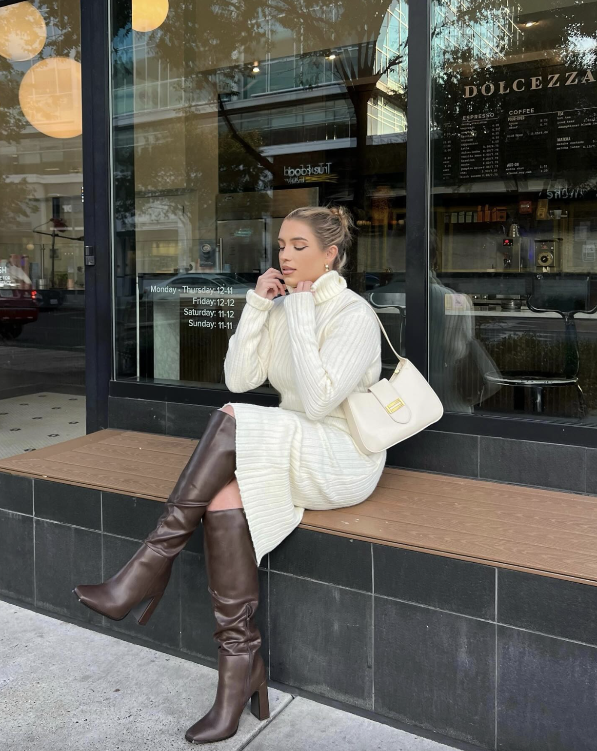 Style tip: balance the all-white look with a camel coat or a tan crossbody bag for contrast, or keep it monochromatic with silver accessories for a sleek, modern finish. This sweater dress outfit idea is perfect for making your fall wardrobe feel fresh, fun, and on-trend.