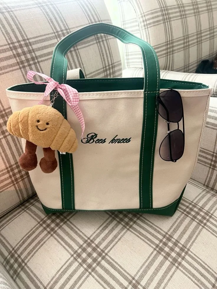 LL Bean’s Boat and Tote became synonymous with classic American style, known for its reinforced handles, boxy shape, and personalized monograms that traditionally featured initials in an understated font. However, what was once a signifier of old-money elegance has now taken on a delightfully ironic twist, flipping the script on tradition and turning this practical bag into a playful, fashion-forward accessory.