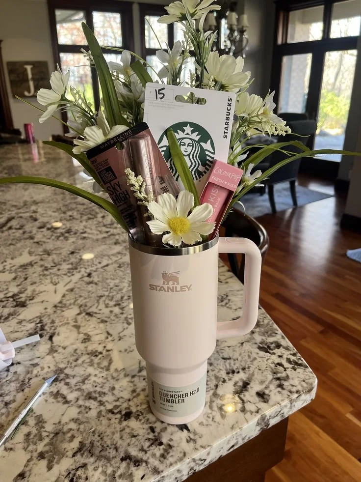 A stuffed Stanley cup gift (also called a "loaded Stanley" or "Stanley gift bouquet") is exactly what it sounds like: a classic Stanley tumbler (or any water tumbler) filled with carefully curated gifts, often topped with faux or real flowers and arranged like a bouquet. The cup itself becomes part of the gift — and since Stanley tumblers are one of the most coveted items out there right now, recipients get something they'll actually use every single day.
