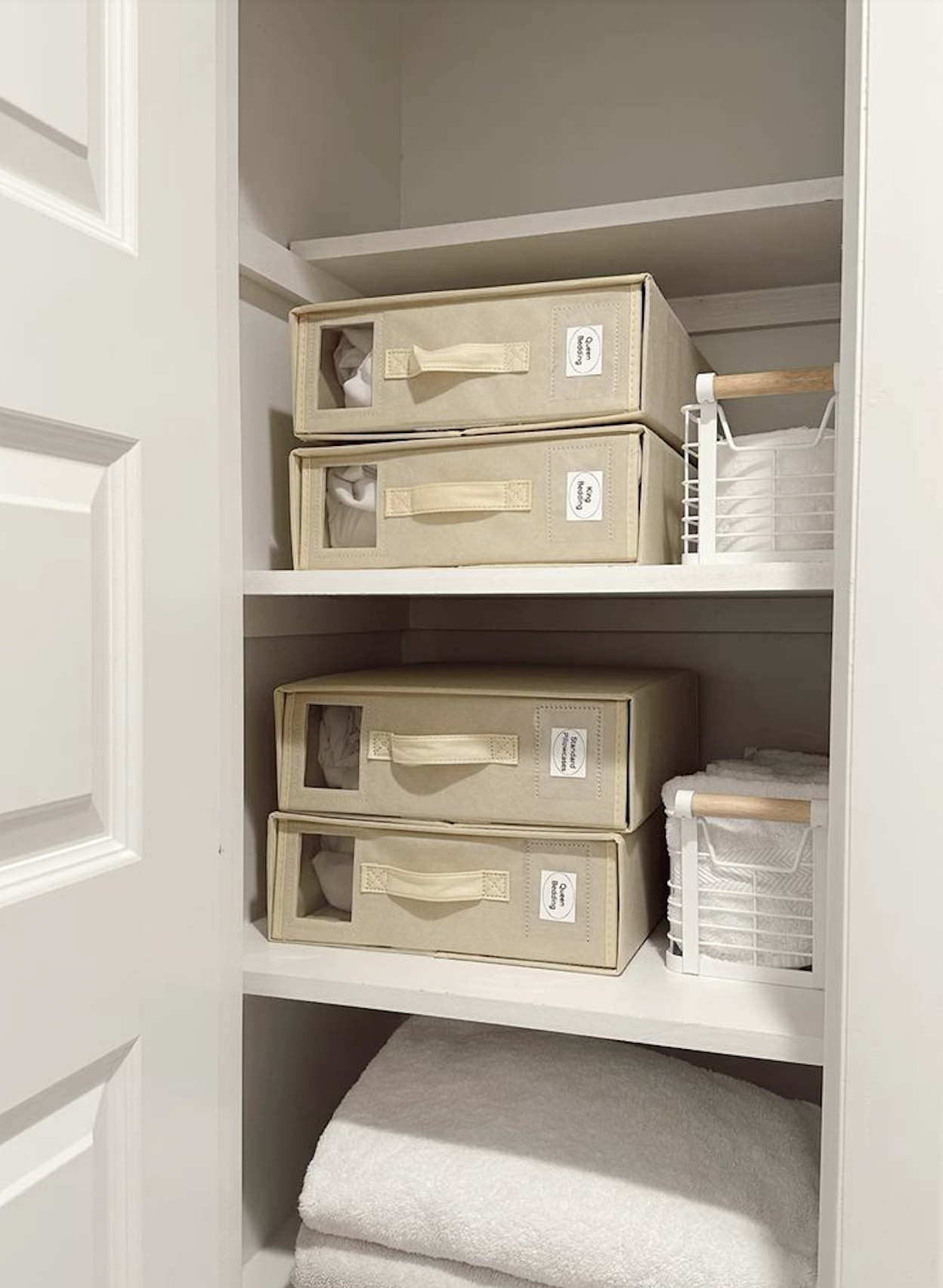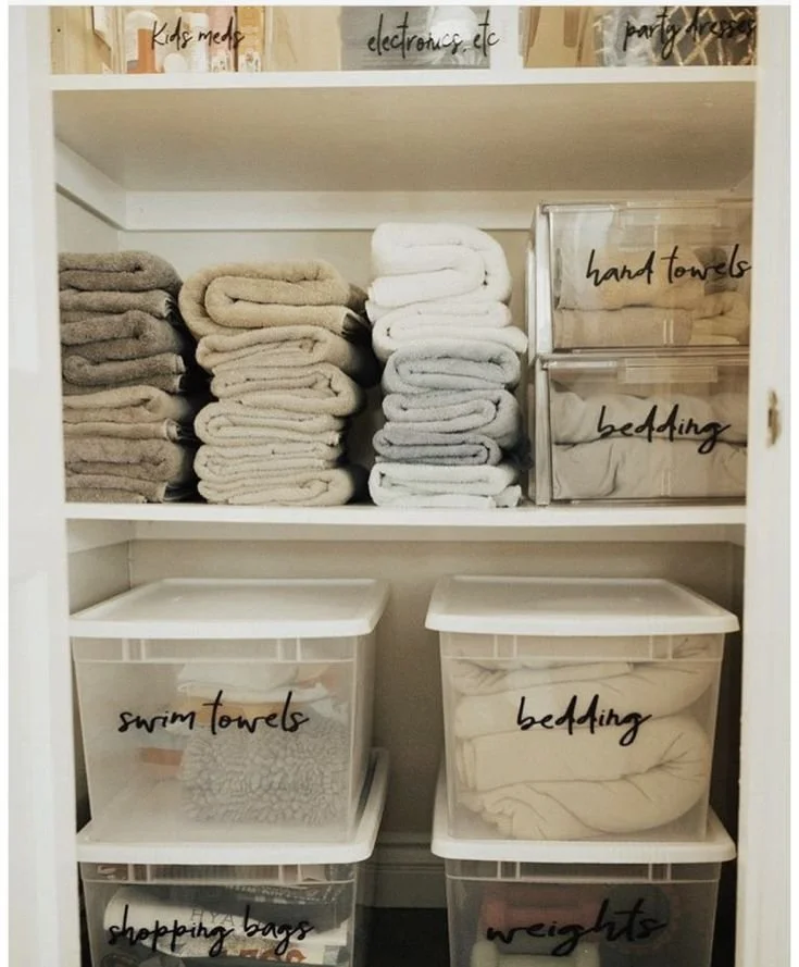 Keep seasonal items (like flannel sheets or beach towels) in their own bin so they don’t mix with your everyday essentials.
