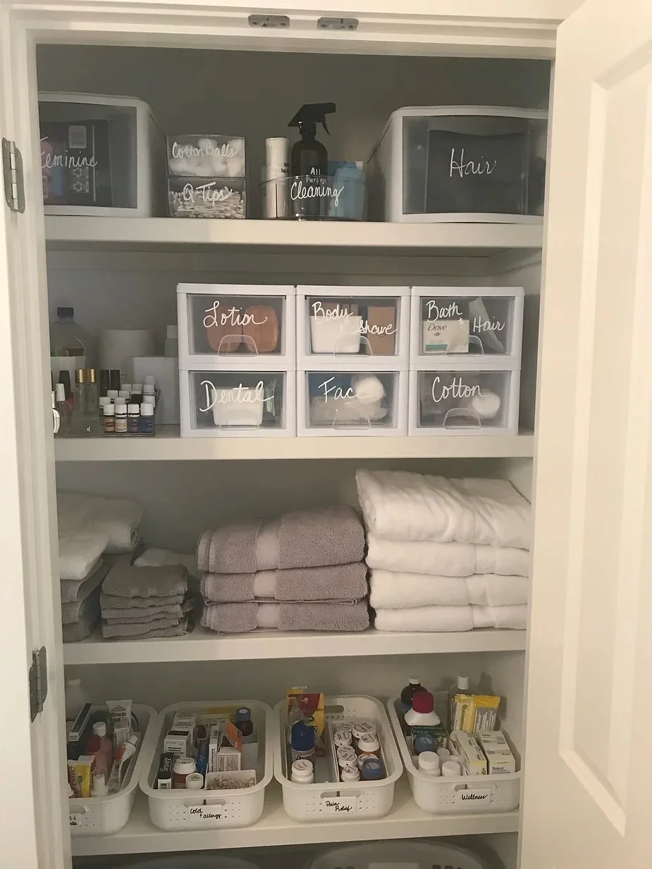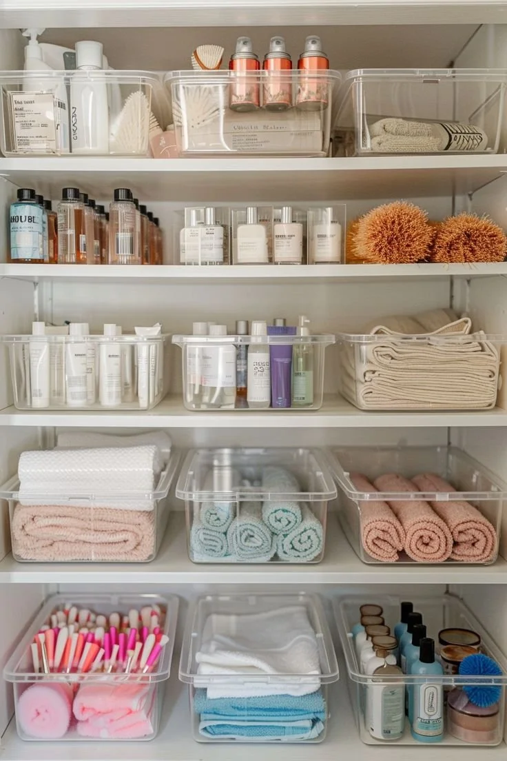 Clear bins instantly transform a messy bathroom closet into a well-styled, functional space. Because everything is visible, you can quickly find what you need and avoid overbuying duplicates. It’s an easy way to make your storage look streamlined while keeping your daily essentials within reach.