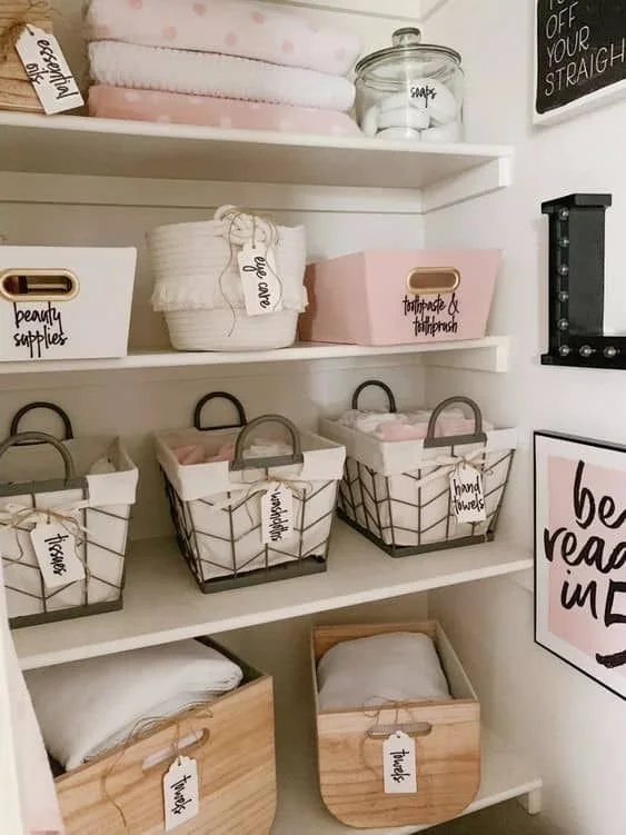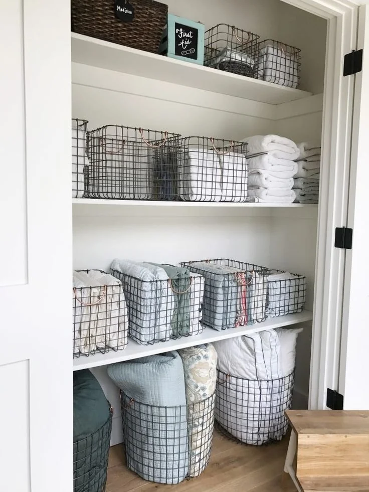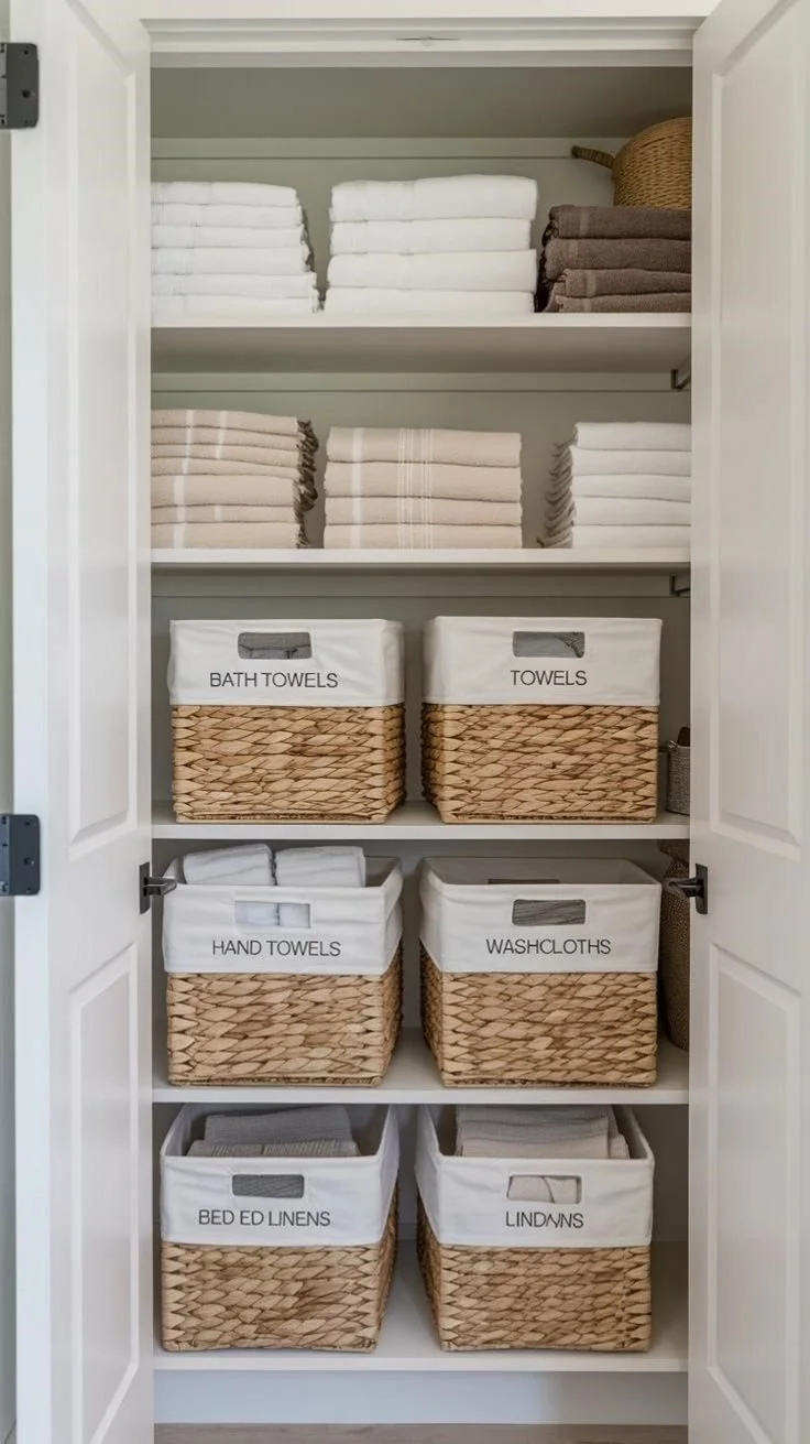 Using the same style of baskets throughout your linen closet instantly creates a sense of order. Even if the contents vary—from towels and sheets to toiletries—the uniform look makes the space feel neat, calm, and intentional.